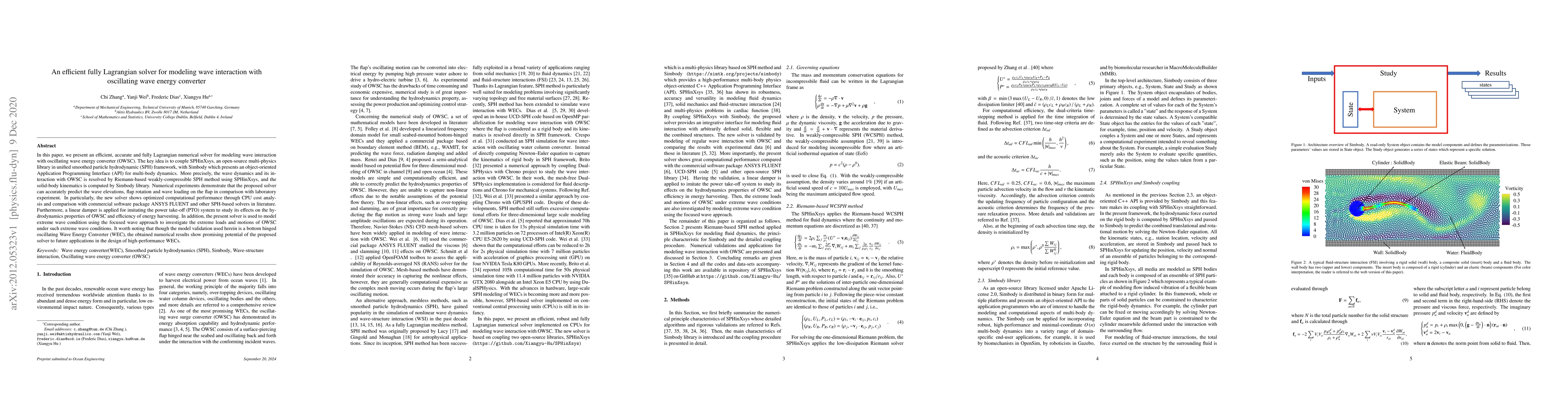 This paper introduces a fully Lagrangian solver combining SPHinXsys and Simbody to model wave interaction with oscillating wave energy converters (OWSC). The solver accurately predicts wave dynamics and flap motion, demonstrating optimized computational performance compared to commercial software and other solvers. It also investigates the effects of a linear damper and extreme wave conditions on OWSC efficiency and performance.