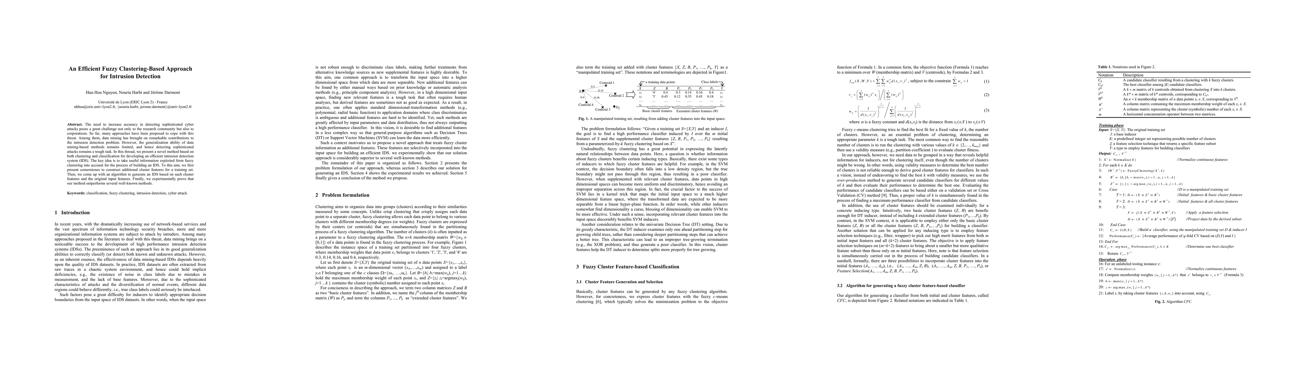 This paper proposes a novel fuzzy clustering-based approach for intrusion detection that enhances the generalization ability of data mining methods. The method constructs additional cluster features and uses them to develop an efficient intrusion detection system, demonstrating superior performance over existing techniques.