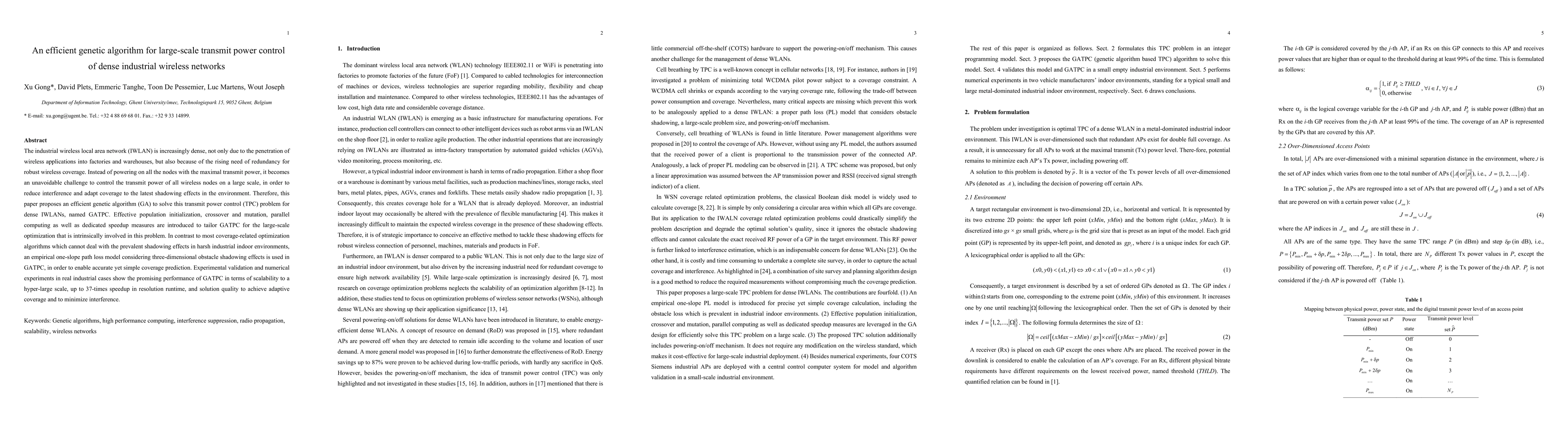 This paper proposes an efficient genetic algorithm (GA) named GATPC for large-scale transmit power control in dense industrial wireless networks, achieving scalability, speedup, and adaptive coverage while minimizing interference. The algorithm incorporates advanced genetic techniques and a three-dimensional path loss model to handle complex shadowing effects.
