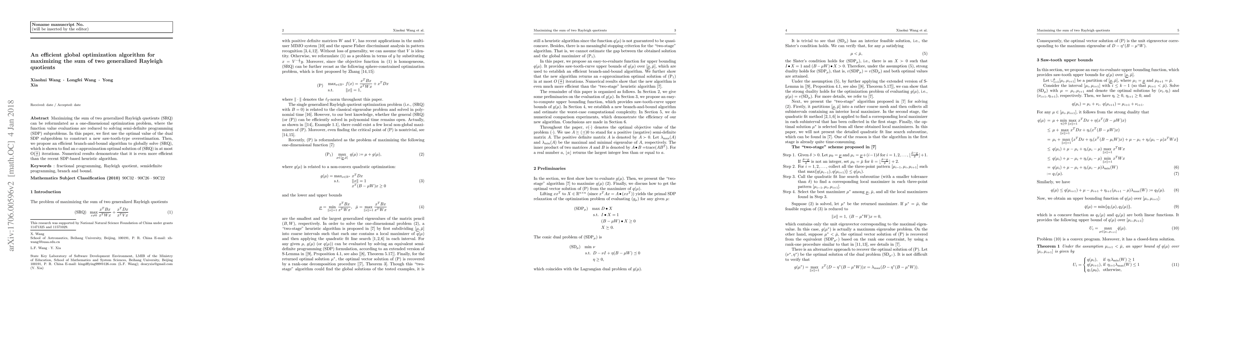Maximizing the sum of two generalized Rayleigh quotients (SRQ) can be reformulated as a one-dimensional optimization problem, where the function value evaluations are reduced to solving semi-definite programming (SDP) subproblems. In this paper, we first use the dual SDP subproblem to construct an explicit overestimation and then propose a branch-and-bound algorithm to globally solve (SRQ). Numerical results demonstrate that it is even more efficient than the recent SDP-based heuristic algorithm.