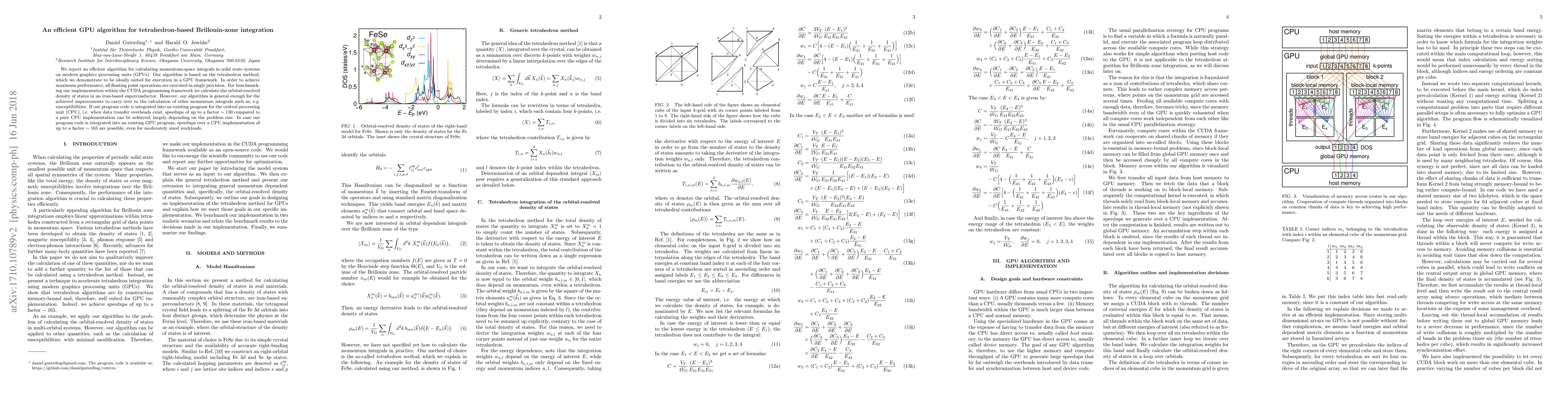 We report an efficient algorithm for calculating momentum-space integrals in solid state systems on modern graphics processing units (GPUs). Our algorithm is based on the tetrahedron method, which we demonstrate to be ideally suited for execution in a GPU framework. In order to achieve maximum performance, all floating point operations are executed in single precision. For benchmarking our implementation within the CUDA programming framework we calculate the orbital-resolved density of states in an iron-based superconductor. However, our algorithm is general enough for the achieved improvements to carry over to the calculation of other momentum integrals such as, e.g. susceptibilities. If our program code is integrated into an existing program for the central processing unit (CPU), i.e. when data transfer overheads exist, speedups of up to a factor $\sim130$ compared to a pure CPU implementation can be achieved, largely depending on the problem size. In case our program code is integrated into an existing GPU program, speedups over a CPU implementation of up to a factor $\sim165$ are possible, even for moderately sized workloads.