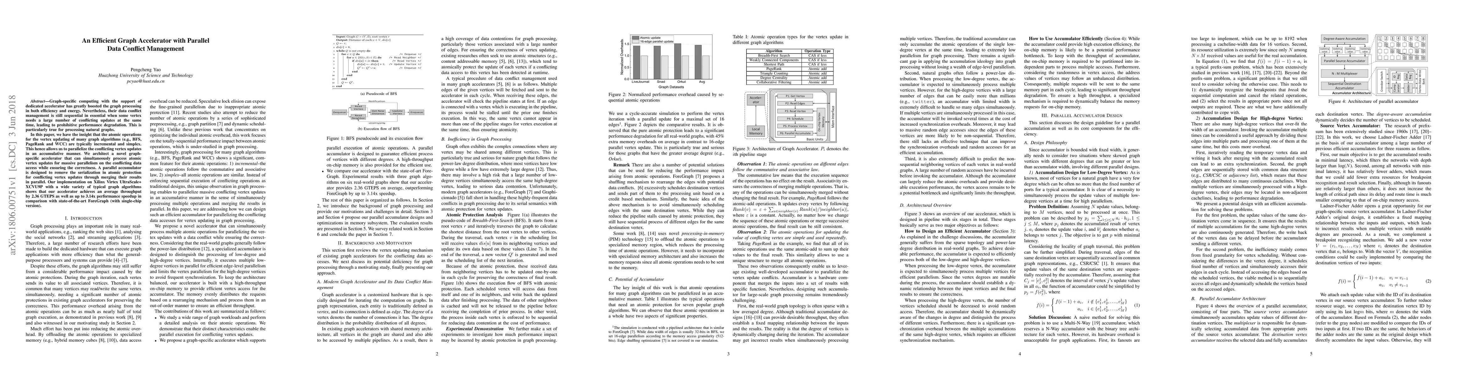 This paper proposes a novel graph accelerator that efficiently manages parallel data conflicts through incremental atomic operations, achieving significant performance improvements and throughput for graph processing algorithms like BFS and PageRank. The accelerator employs a parallel accumulator to merge results of conflicting vertex updates, demonstrating a 3.14x speedup over existing solutions.