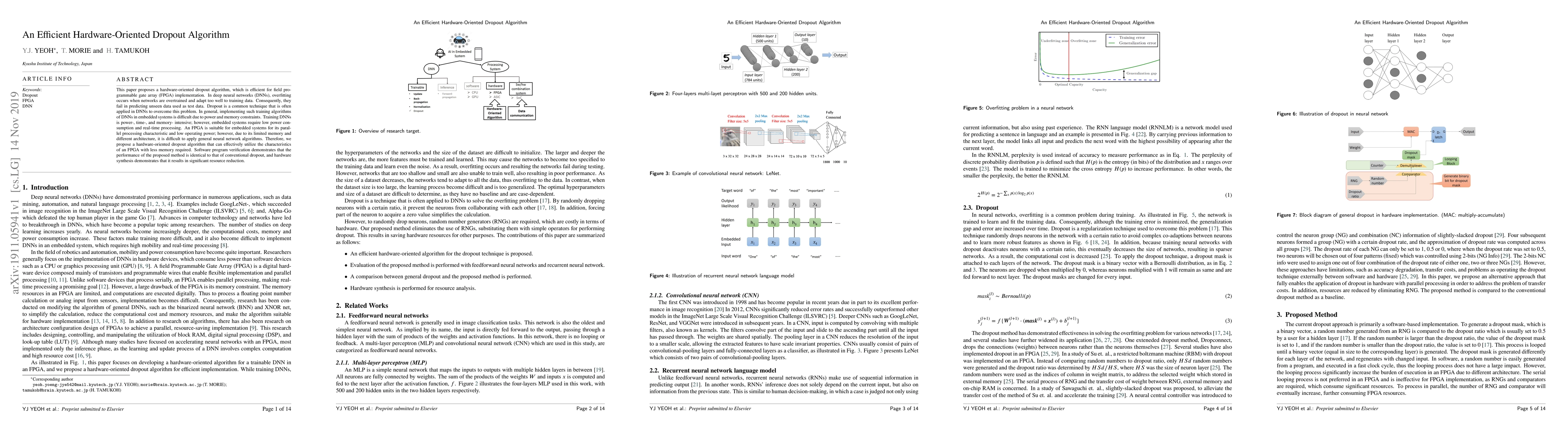 This paper proposes a hardware-oriented dropout algorithm, which is efficient for field programmable gate array (FPGA) implementation. In deep neural networks (DNNs), overfitting occurs when networks are overtrained and adapt too well to training data. Consequently, they fail in predicting unseen data used as test data. Dropout is a common technique that is often applied in DNNs to overcome this problem. In general, implementing such training algorithms of DNNs in embedded systems is difficult due to power and memory constraints. Training DNNs is power-, time-, and memory- intensive; however, embedded systems require low power consumption and real-time processing. An FPGA is suitable for embedded systems for its parallel processing characteristic and low operating power; however, due to its limited memory and different architecture, it is difficult to apply general neural network algorithms. Therefore, we propose a hardware-oriented dropout algorithm that can effectively utilize the characteristics of an FPGA with less memory required. Software program verification demonstrates that the performance of the proposed method is identical to that of conventional dropout, and hardware synthesis demonstrates that it results in significant resource reduction.