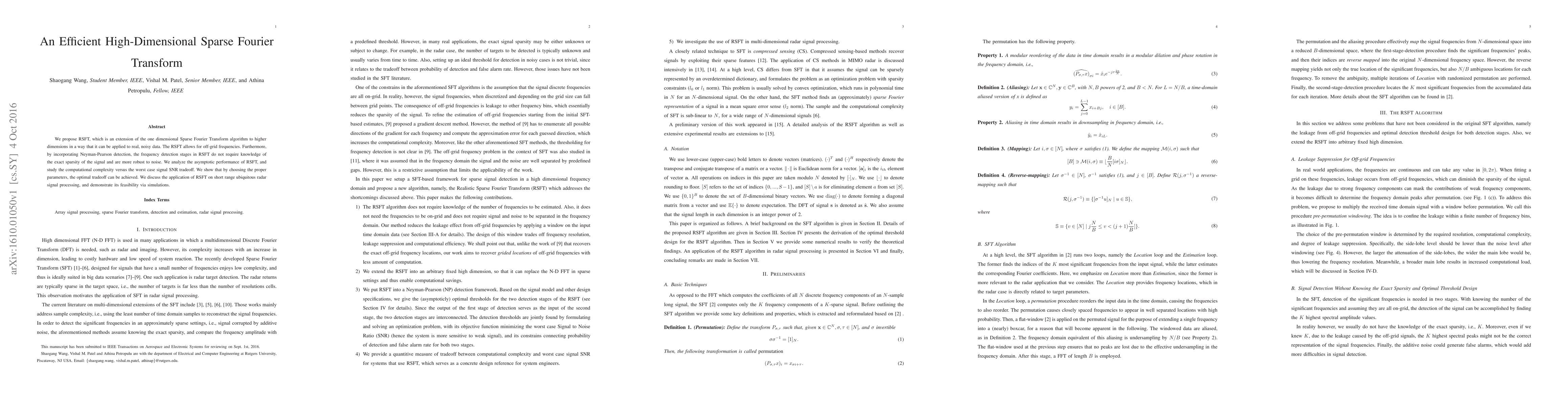 This paper introduces RSFT, an advanced high-dimensional sparse Fourier Transform algorithm that extends one-dimensional Sparse Fourier Transform to handle real, noisy data with off-grid frequencies. It demonstrates robustness to noise and optimal performance through computational complexity analysis, showing its application in radar signal processing.