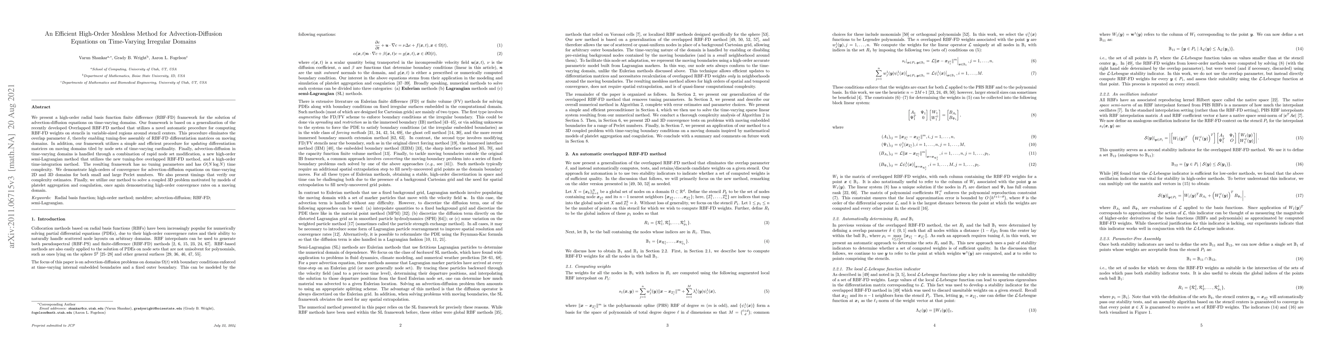 This paper introduces a high-order meshless method using radial basis function finite difference (RBF-FD) for solving advection-diffusion equations on time-varying domains. The method eliminates the need for tuning parameters and achieves $O(N \log N)$ complexity, demonstrating high-order convergence on both 2D and 3D domains.