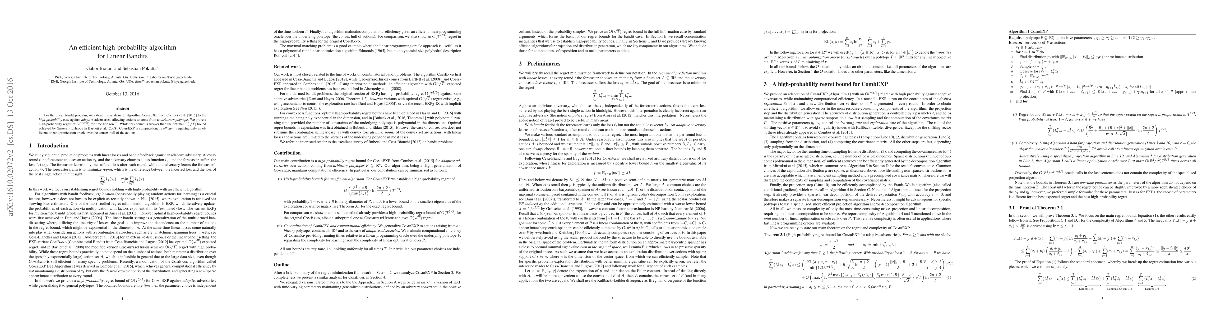 For the linear bandit problem, we extend the analysis of algorithm CombEXP from [R. Combes, M. S. Talebi Mazraeh Shahi, A. Proutiere, and M. Lelarge. Combinatorial bandits revisited. In C. Cortes, N. D. Lawrence, D. D. Lee, M. Sugiyama, and R. Garnett, editors, Advances in Neural Information Processing Systems 28, pages 2116--2124. Curran Associates, Inc., 2015. URL http://papers.nips.cc/paper/5831-combinatorial-bandits-revisited.pdf] to the high-probability case against adaptive adversaries, allowing actions to come from an arbitrary polytope. We prove a high-probability regret of \(O(T^{2/3})\) for time horizon \(T\). While this bound is weaker than the optimal \(O(\sqrt{T})\) bound achieved by GeometricHedge in [P. L. Bartlett, V. Dani, T. Hayes, S. Kakade, A. Rakhlin, and A. Tewari. High-probability regret bounds for bandit online linear optimization. In 21th Annual Conference on Learning Theory (COLT 2008), July 2008. http://eprints.qut.edu.au/45706/1/30-Bartlett.pdf], CombEXP is computationally efficient, requiring only an efficient linear optimization oracle over the convex hull of the actions.