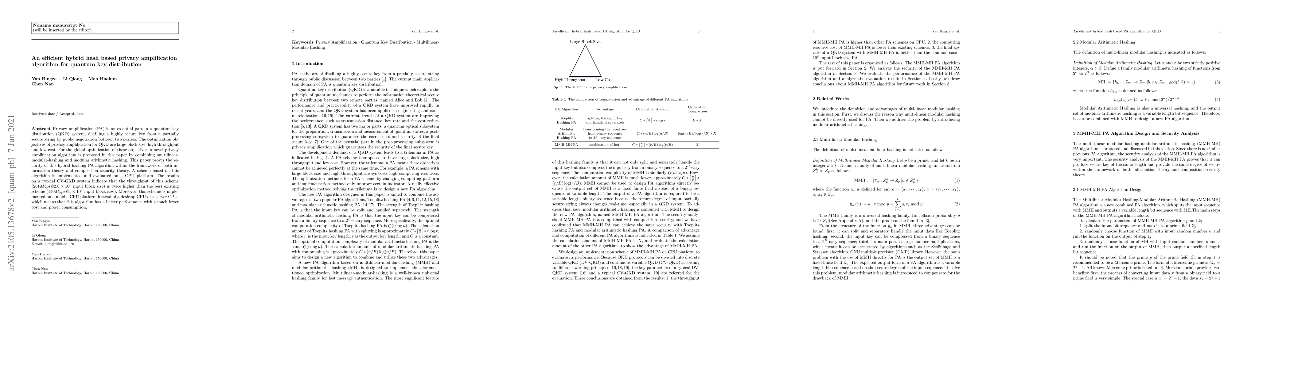 This paper proposes an efficient hybrid hash-based privacy amplification algorithm for quantum key distribution (QKD), combining multilinear-modular-hashing and modular arithmetic hashing to achieve high throughput and low cost. The algorithm's security is proven within information theory and composition security frameworks, and its implementation on a mobile CPU platform shows a throughput twice that of the best existing scheme.