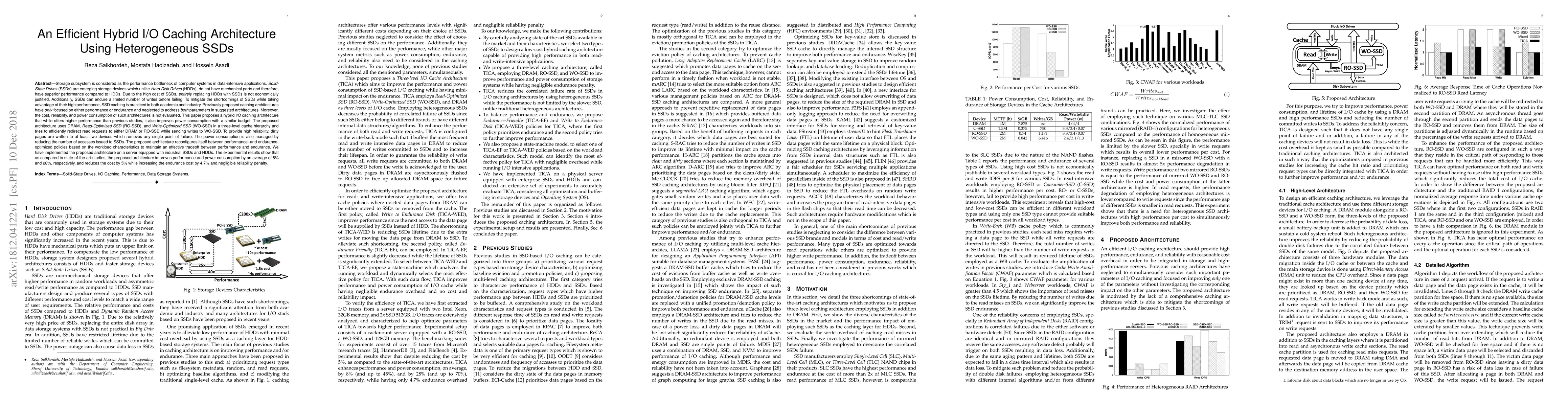 This paper proposes a hybrid I/O caching architecture called TICA, which utilizes DRAM, Read-Optimized SSD (RO-SSD), and Write-Optimized SSD (WO-SSD) in a three-level cache hierarchy. TICA efficiently redirects read requests to DRAM or RO-SSD and writes to WO-SSD, improving performance, power consumption, and endurance.
