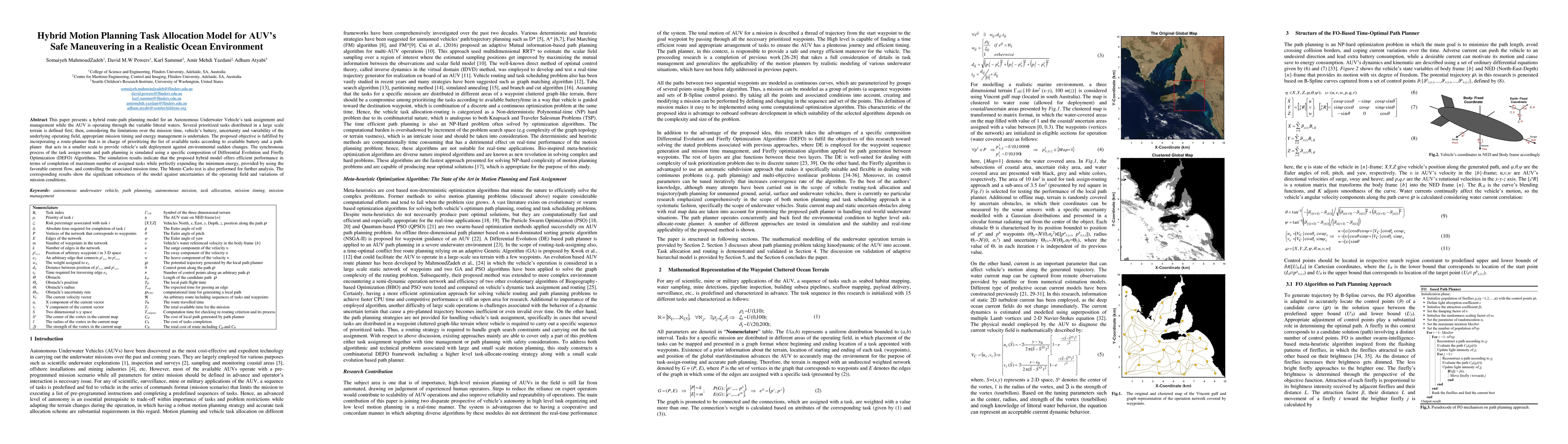 This paper presents a hybrid route-path planning model for an Autonomous Underwater Vehicle's task assignment and management while the AUV is operating through the variable littoral waters. Several prioritized tasks distributed in a large scale terrain is defined first; then, considering the limitations over the mission time, vehicle's battery, uncertainty and variability of the underlying operating field, appropriate mission timing and energy management is undertaken. The proposed objective is fulfilled by incorporating a route-planner that is in charge of prioritizing the list of available tasks according to available battery and a path-planer that acts in a smaller scale to provide vehicle's safe deployment against environmental sudden changes. The synchronous process of the task assign-route and path planning is simulated using a specific composition of Differential Evolution and Firefly Optimization (DEFO) Algorithms. The simulation results indicate that the proposed hybrid model offers efficient performance in terms of completion of maximum number of assigned tasks while perfectly expending the minimum energy, provided by using the favorable current flow, and controlling the associated mission time. The Monte-Carlo test is also performed for further analysis. The corresponding results show the significant robustness of the model against uncertainties of the operating field and variations of mission conditions.