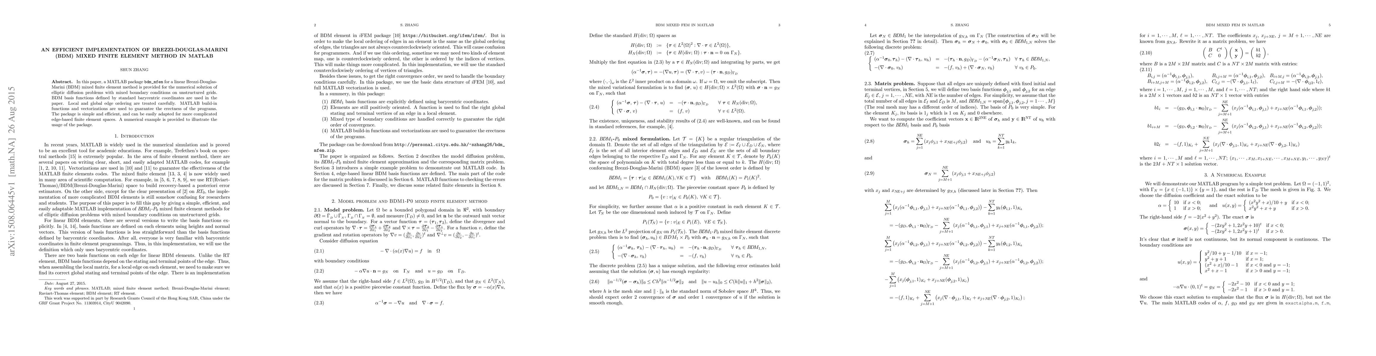 This paper presents a MATLAB package, bdm_mfem, for implementing the Brezzi-Douglas-Marini (BDM) mixed finite element method to solve elliptic diffusion problems on unstructured grids. The package leverages MATLAB functions and vectorizations for efficiency and adaptability to complex finite element spaces.