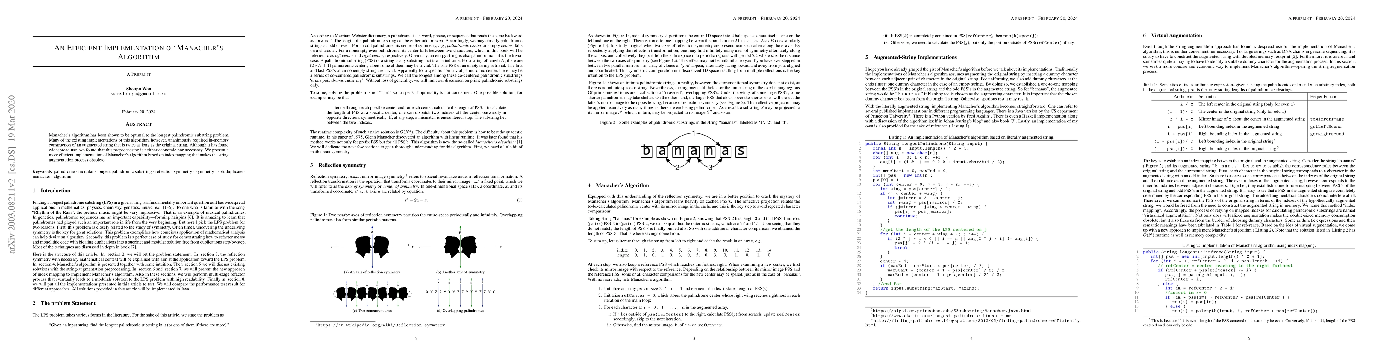 Researchers present a more efficient implementation of Manacher's algorithm that eliminates unnecessary string augmentation, making it faster and more economical.