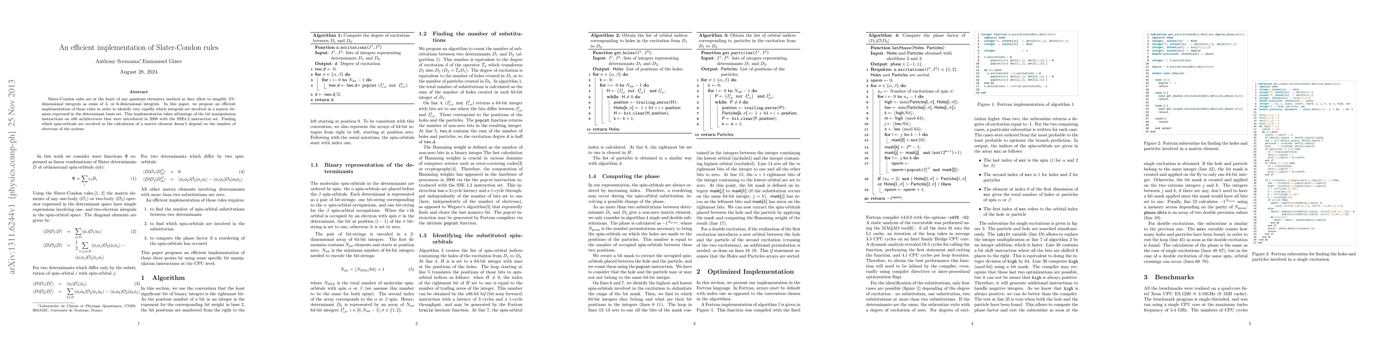 This paper presents an efficient implementation of Slater-Condon rules using bit manipulation instructions on x86 architectures to quickly identify involved integrals in quantum chemistry calculations, independent of the number of electrons. This approach leverages the SSE4.2 instruction set for rapid computation.