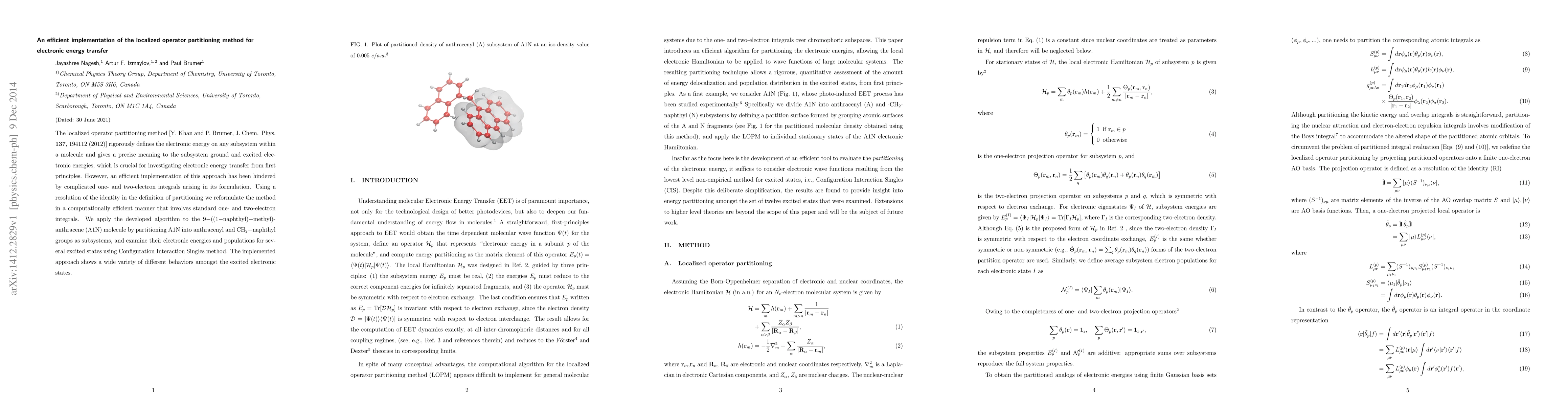 The localized operator partitioning method [Y. Khan and P. Brumer, J. Chem. Phys. 137, 194112 (2012)] rigorously defines the electronic energy on any subsystem within a molecule and gives a precise meaning to the subsystem ground and excited electronic energies, which is crucial for investigating electronic energy transfer from first principles. However, an efficient implementation of this approach has been hindered by complicated one- and two-electron integrals arising in its formulation. Using a resolution of the identity in the definition of partitioning we reformulate the method in a computationally efficient manner that involves standard one- and two-electron integrals. We apply the developed algorithm to the 9-((1-naphthyl)-methyl)-anthracene (A1N) molecule by partitioning A1N into anthracenyl and CH2-naphthyl groups as subsystems, and examine their electronic energies and populations for several excited states using Configuration Interaction Singles method. The implemented approach shows a wide variety of different behaviors amongst the excited electronic states.