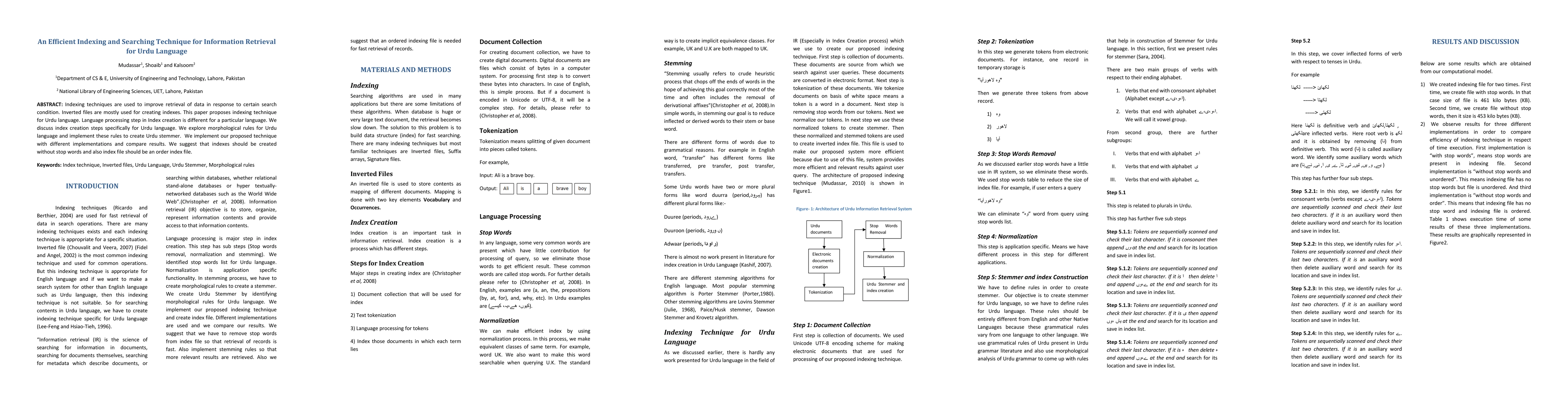 This paper proposes an efficient indexing technique for Urdu language information retrieval using an Urdu stemmer based on morphological rules, and suggests that excluding stop words and using an ordered index file improves search performance. Experimental results demonstrate the effectiveness of the proposed method.