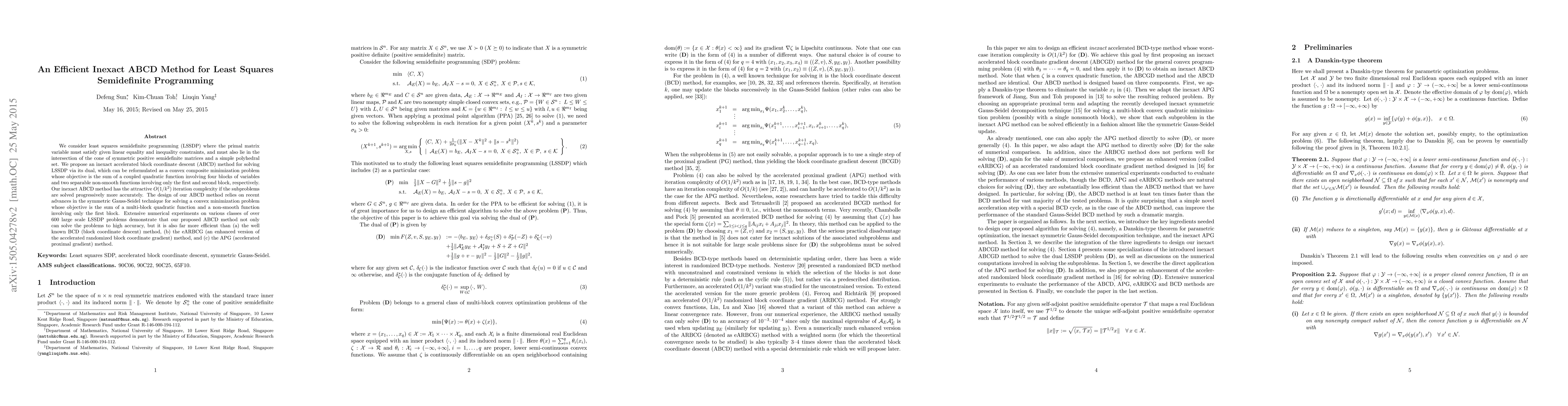 This paper proposes an inexact accelerated block coordinate descent (ABCD) method for solving least squares semidefinite programming (LSSDP) problems, achieving an $O(1/k^2)$ iteration complexity. The method outperforms traditional BCD, eARBCG, and APG methods in efficiency and accuracy, as demonstrated by extensive numerical experiments on over 600 large-scale LSSDP problems.