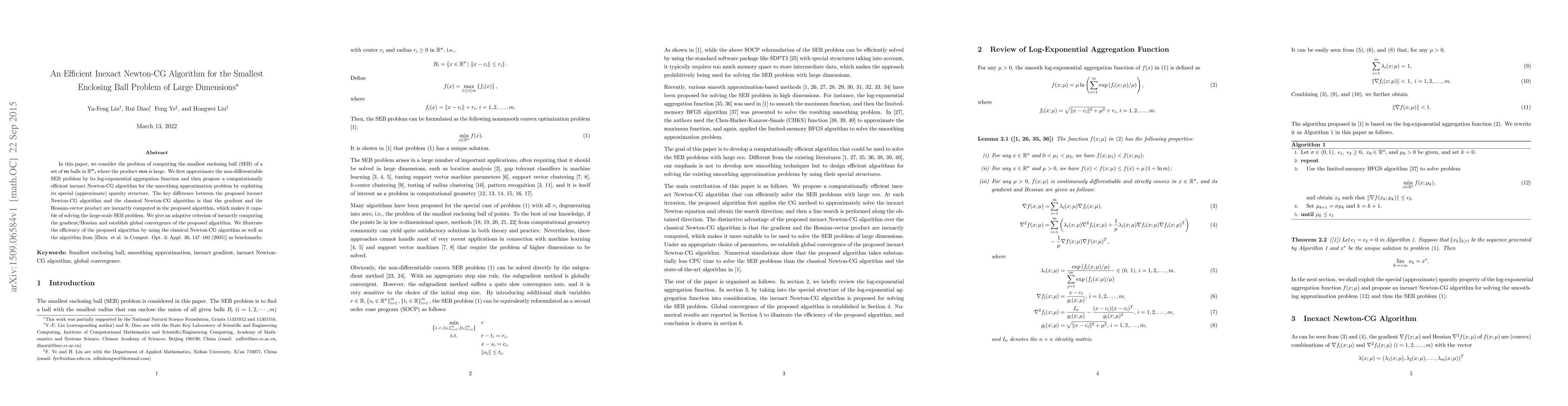 This paper proposes an efficient inexact Newton-CG algorithm to solve the large-scale smallest enclosing ball problem by approximating the non-differentiable problem with a log-exponential function. The algorithm computes gradient and Hessian inexactly to handle large dimensions, demonstrating global convergence and efficiency compared to classical methods.