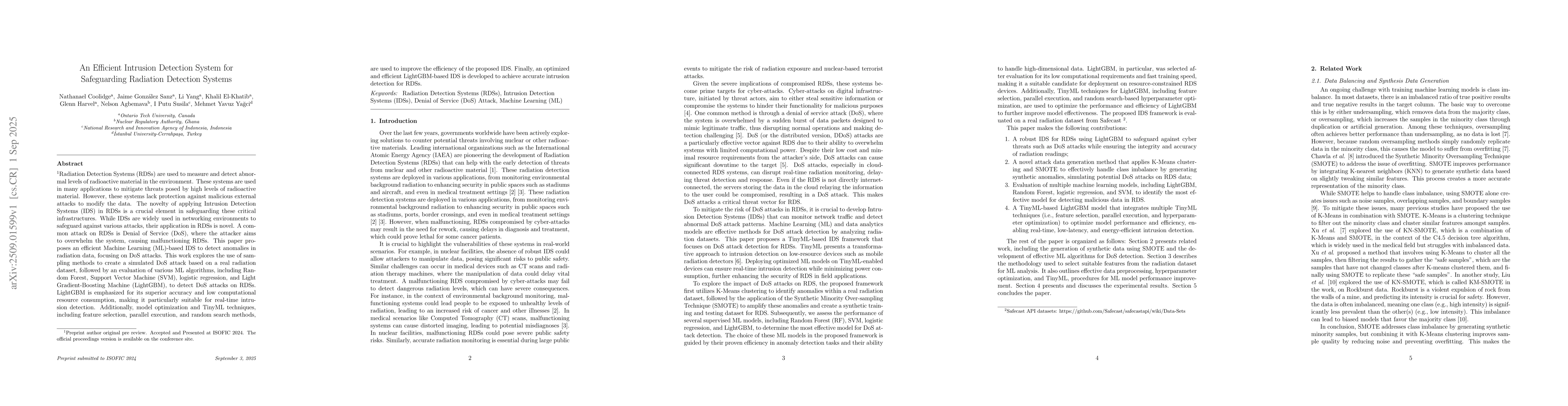 Radiation Detection Systems (RDSs) are used to measure and detect abnormal levels of radioactive material in the environment. These systems are used in many applications to mitigate threats posed by high levels of radioactive material. However, these systems lack protection against malicious external attacks to modify the data. The novelty of applying Intrusion Detection Systems (IDS) in RDSs is a crucial element in safeguarding these critical infrastructures. While IDSs are widely used in networking environments to safeguard against various attacks, their application in RDSs is novel. A common attack on RDSs is Denial of Service (DoS), where the attacker aims to overwhelm the system, causing malfunctioning RDSs. This paper proposes an efficient Machine Learning (ML)-based IDS to detect anomalies in radiation data, focusing on DoS attacks. This work explores the use of sampling methods to create a simulated DoS attack based on a real radiation dataset, followed by an evaluation of various ML algorithms, including Random Forest, Support Vector Machine (SVM), logistic regression, and Light Gradient-Boosting Machine (LightGBM), to detect DoS attacks on RDSs. LightGBM is emphasized for its superior accuracy and low computational resource consumption, making it particularly suitable for real-time intrusion detection. Additionally, model optimization and TinyML techniques, including feature selection, parallel execution, and random search methods, are used to improve the efficiency of the proposed IDS. Finally, an optimized and efficient LightGBM-based IDS is developed to achieve accurate intrusion detection for RDSs.