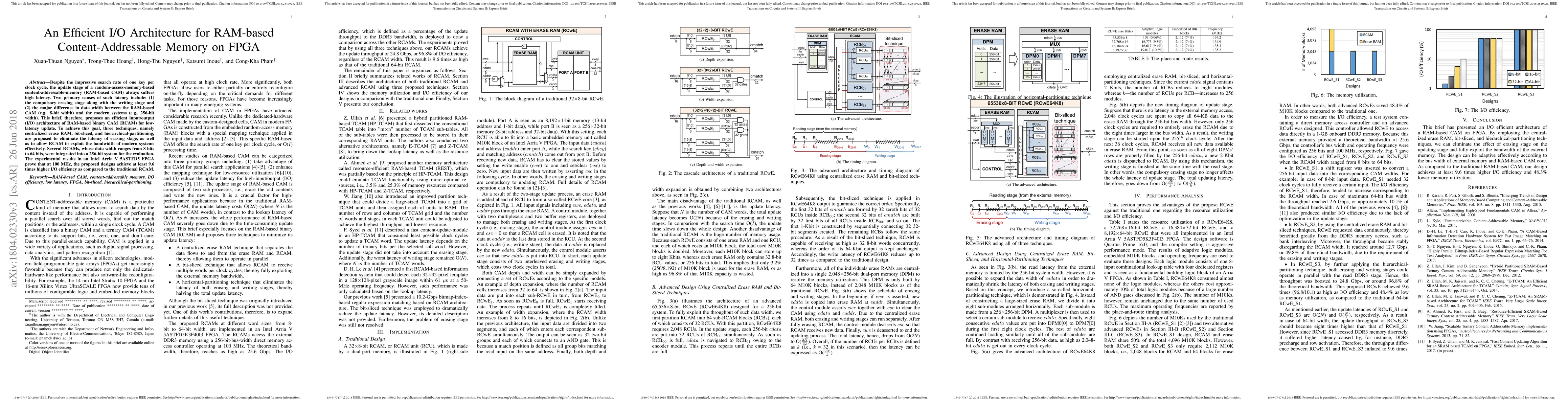 Despite the impressive search rate of one key per clock cycle, the update stage of a random-access-memory-based content-addressable-memory (RAM-based CAM) always suffers high latency. Two primary causes of such latency include: (1) the compulsory erasing stage along with the writing stage and (2) the major difference in data width between the RAM-based CAM (e.g., 8-bit width) and the modern systems (e.g., 256-bit width). This brief, therefore, aims for an efficient input/output (I/O) architecture of RAM-based binary CAM (RCAM) for low-latency update. To achieve this goal, three techniques, namely centralized erase RAM, bit-sliced, and hierarchical-partitioning, are proposed to eliminate the latency of erasing stage, as well as to allow RCAM to exploit the bandwidth of modern systems effectively. Several RCAMs, whose data width ranges from 8 bits to 64 bits, were integrated into a 256-bit system for the evaluation. The experimental results in an Intel Arria V 5ASTFD5 FPGA prove that at 100 MHz, the proposed designs achieve at least 9.6 times higher I/O efficiency as compared to the traditional RCAM.