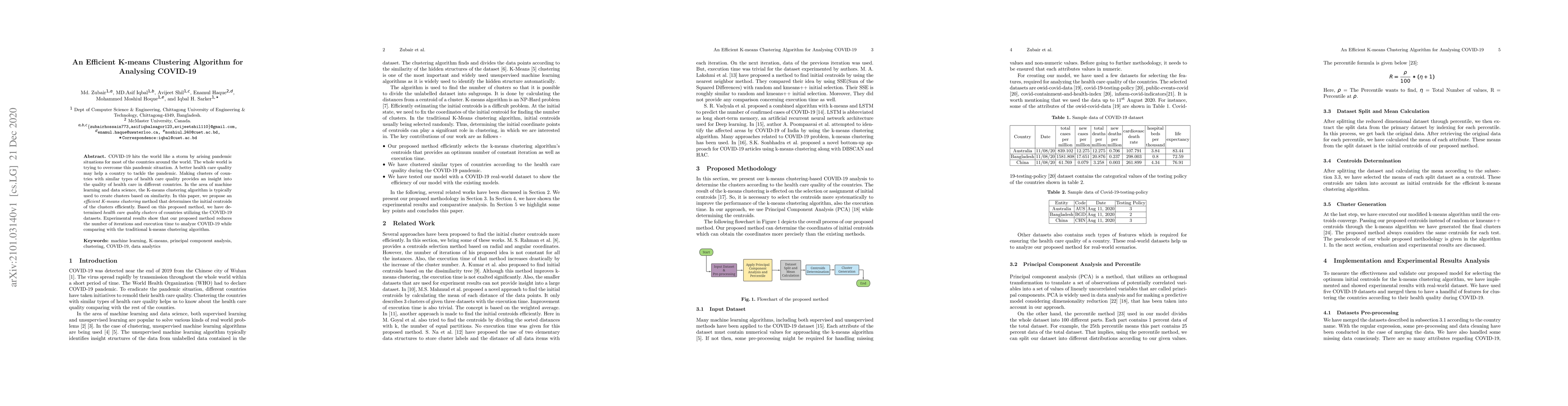 This paper proposes an efficient K-means clustering algorithm to analyze COVID-19 data, focusing on determining initial centroids more effectively. The method reduces iteration count and execution time compared to traditional K-means, providing insights into healthcare quality clusters across countries.
