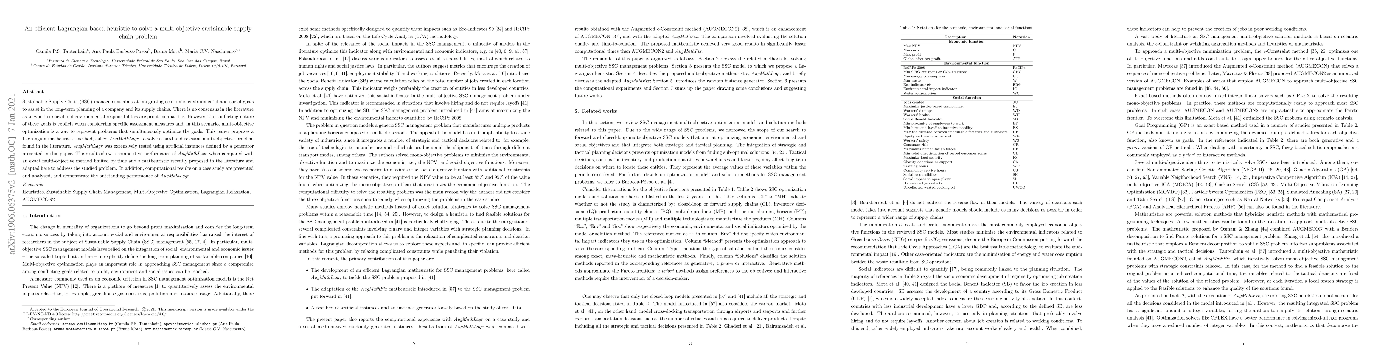 This paper introduces a Lagrangian-based matheuristic, $AugMathLagr$, to tackle multi-objective sustainable supply chain problems, balancing economic, environmental, and social goals. The method demonstrates competitive performance against existing techniques in extensive testing and computational case studies.