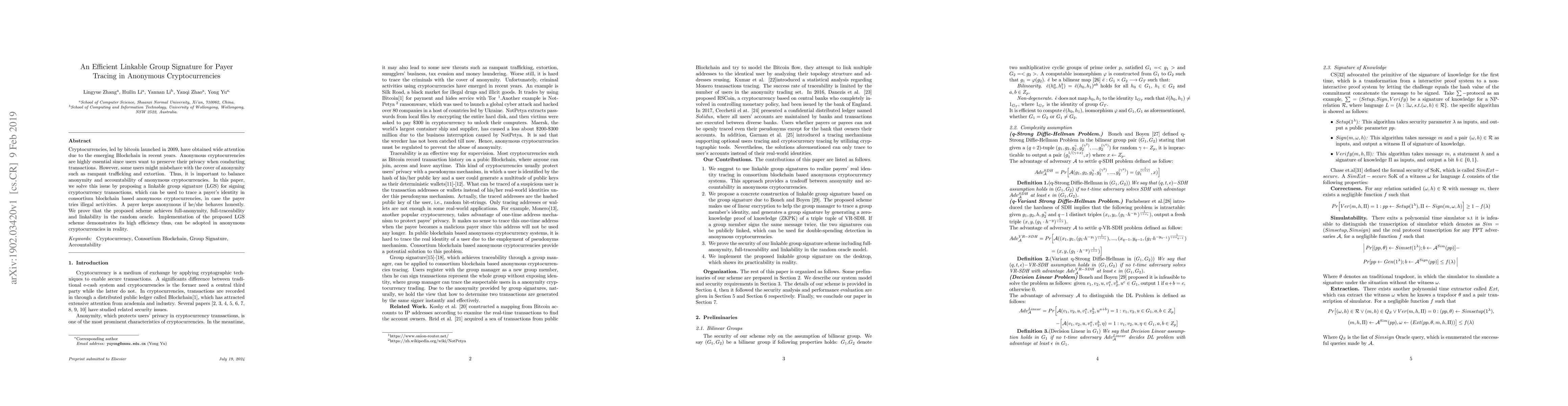 A new linkable group signature scheme is proposed to balance anonymity and accountability in anonymous cryptocurrencies, allowing for efficient tracing of illegal activities while maintaining user privacy.
