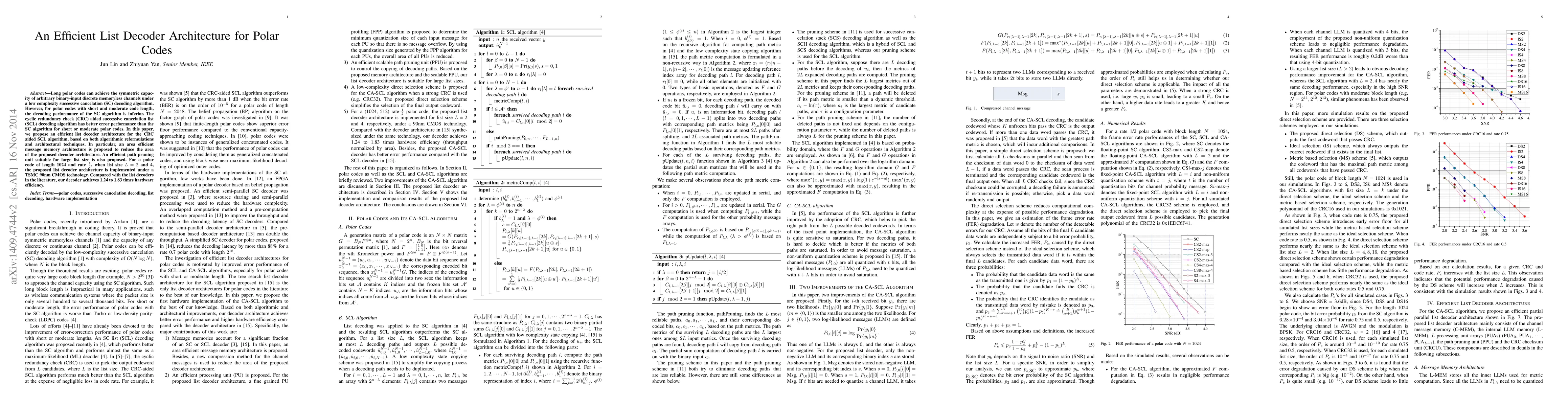 This paper proposes an efficient list decoder architecture for CRC aided SCL decoding of polar codes, achieving better performance for short and moderate code lengths. The architecture includes an area-efficient message memory and a path pruning unit, resulting in 1.33 to 1.96 times higher hardware efficiency compared to existing decoders.