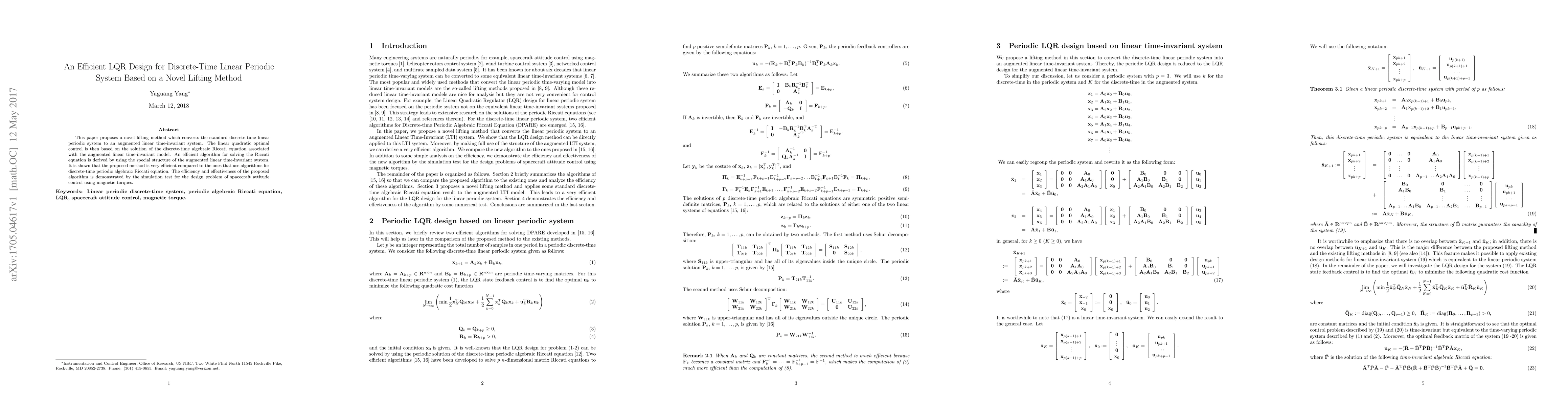 This paper introduces a novel lifting method to convert discrete-time linear periodic systems into augmented linear time-invariant systems, enabling efficient LQR design using a derived algorithm for solving the associated discrete-time algebraic Riccati equation. The method is shown to outperform existing discrete-time periodic algebraic Riccati equation algorithms, demonstrated through spacecraft attitude control simulations.