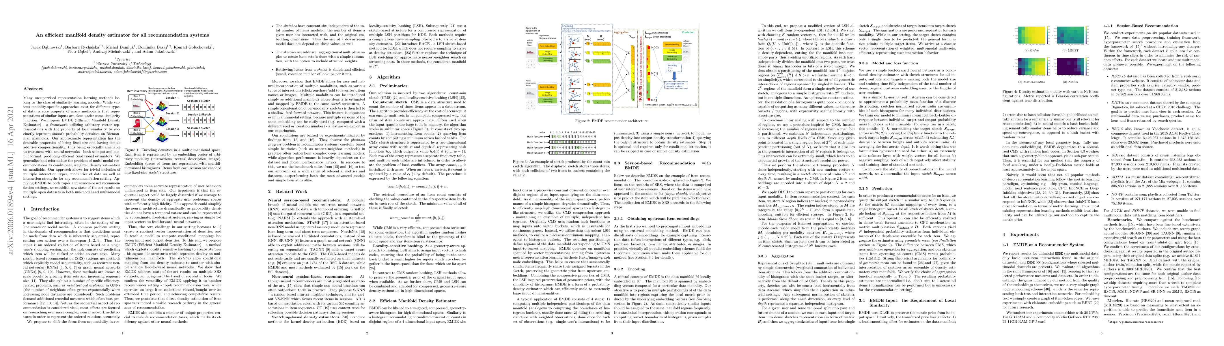 Many unsupervised representation learning methods belong to the class of similarity learning models. While various modality-specific approaches exist for different types of data, a core property of many methods is that representations of similar inputs are close under some similarity function. We propose EMDE (Efficient Manifold Density Estimator) - a framework utilizing arbitrary vector representations with the property of local similarity to succinctly represent smooth probability densities on Riemannian manifolds. Our approximate representation has the desirable properties of being fixed-size and having simple additive compositionality, thus being especially amenable to treatment with neural networks - both as input and output format, producing efficient conditional estimators. We generalize and reformulate the problem of multi-modal recommendations as conditional, weighted density estimation on manifolds. Our approach allows for trivial inclusion of multiple interaction types, modalities of data as well as interaction strengths for any recommendation setting. Applying EMDE to both top-k and session-based recommendation settings, we establish new state-of-the-art results on multiple open datasets in both uni-modal and multi-modal settings.