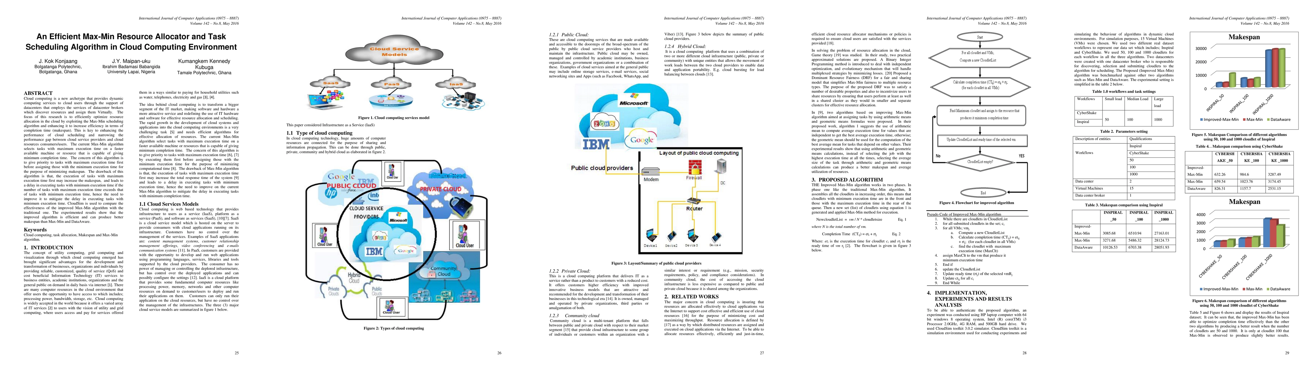 Cloud computing is a new archetype that provides dynamic computing services to cloud users through the support of datacenters that employs the services of datacenter brokers which discover resources and assign them Virtually. The focus of this research is to efficiently optimize resource allocation in the cloud by exploiting the Max-Min scheduling algorithm and enhancing it to increase efficiency in terms of completion time (makespan). This is key to enhancing the performance of cloud scheduling and narrowing the performance gap between cloud service providers and cloud resources consumers/users. The current Max-Min algorithm selects tasks with maximum execution time on a faster available machine or resource that is capable of giving minimum completion time. The concern of this algorithm is to give priority to tasks with maximum execution time first before assigning those with the minimum execution time for the purpose of minimizing makespan. The drawback of this algorithm is that, the execution of tasks with maximum execution time first may increase the makespan, and leads to a delay in executing tasks with minimum execution time if the number of tasks with maximum execution time exceeds that of tasks with minimum execution time, hence the need to improve it to mitigate the delay in executing tasks with minimum execution time. CloudSim is used to compare the effectiveness of the improved Max-Min algorithm with the traditional one. The experimented results show that the improved algorithm is efficient and can produce better makespan than Max-Min and DataAware.