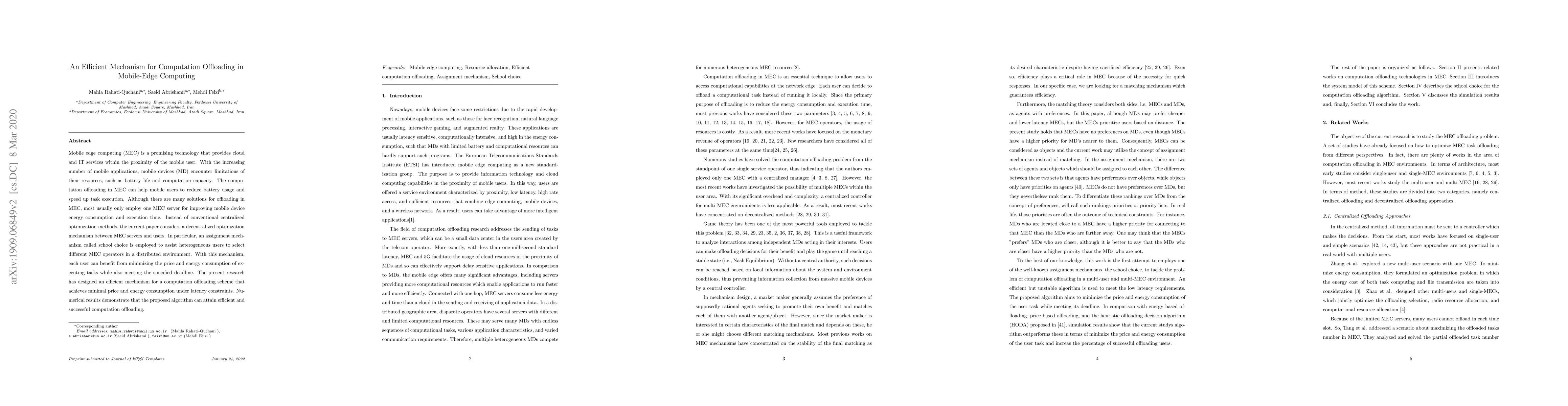 Mobile edge computing (MEC) is a promising technology that provides cloud and IT services within the proximity of the mobile user. With the increasing number of mobile applications, mobile devices (MD) encounter limitations of their resources, such as battery life and computation capacity. The computation offloading in MEC can help mobile users to reduce battery usage and speed up task execution. Although there are many solutions for offloading in MEC, most usually only employ one MEC server for improving mobile device energy consumption and execution time. Instead of conventional centralized optimization methods, the current paper considers a decentralized optimization mechanism between MEC servers and users. In particular, an assignment mechanism called school choice is employed to assist heterogeneous users to select different MEC operators in a distributed environment. With this mechanism, each user can benefit from minimizing the price and energy consumption of executing tasks while also meeting the specified deadline. The present research has designed an efficient mechanism for a computation offloading scheme that achieves minimal price and energy consumption under latency constraints. Numerical results demonstrate that the proposed algorithm can attain efficient and successful computation offloading.