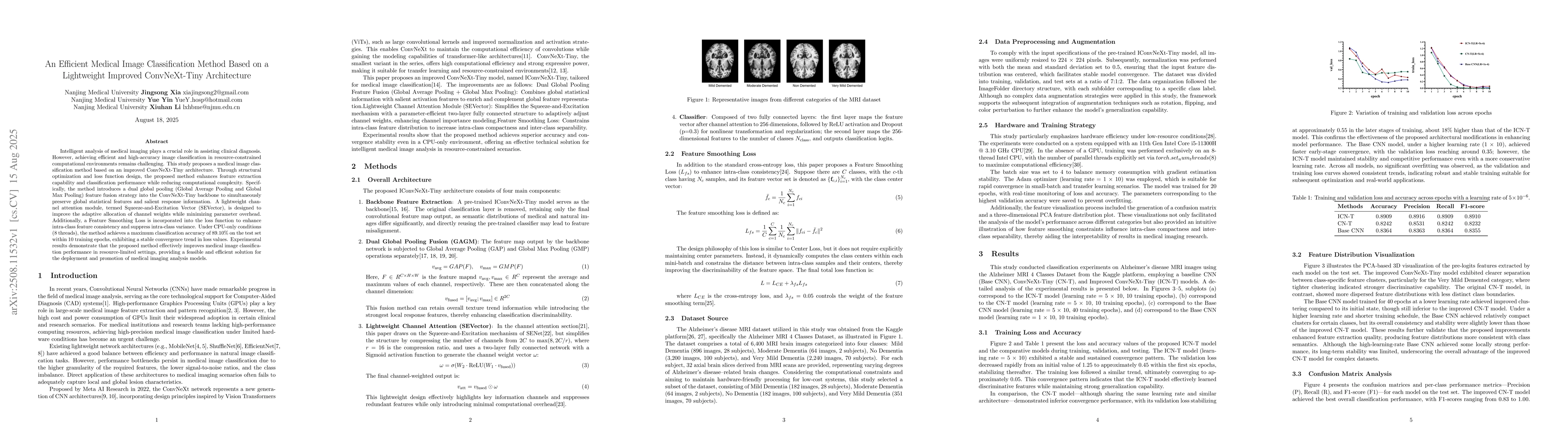 Intelligent analysis of medical imaging plays a crucial role in assisting clinical diagnosis. However, achieving efficient and high-accuracy image classification in resource-constrained computational environments remains challenging. This study proposes a medical image classification method based on an improved ConvNeXt-Tiny architecture. Through structural optimization and loss function design, the proposed method enhances feature extraction capability and classification performance while reducing computational complexity. Specifically, the method introduces a dual global pooling (Global Average Pooling and Global Max Pooling) feature fusion strategy into the ConvNeXt-Tiny backbone to simultaneously preserve global statistical features and salient response information. A lightweight channel attention module, termed Squeeze-and-Excitation Vector (SEVector), is designed to improve the adaptive allocation of channel weights while minimizing parameter overhead. Additionally, a Feature Smoothing Loss is incorporated into the loss function to enhance intra-class feature consistency and suppress intra-class variance. Under CPU-only conditions (8 threads), the method achieves a maximum classification accuracy of 89.10% on the test set within 10 training epochs, exhibiting a stable convergence trend in loss values. Experimental results demonstrate that the proposed method effectively improves medical image classification performance in resource-limited settings, providing a feasible and efficient solution for the deployment and promotion of medical imaging analysis models.