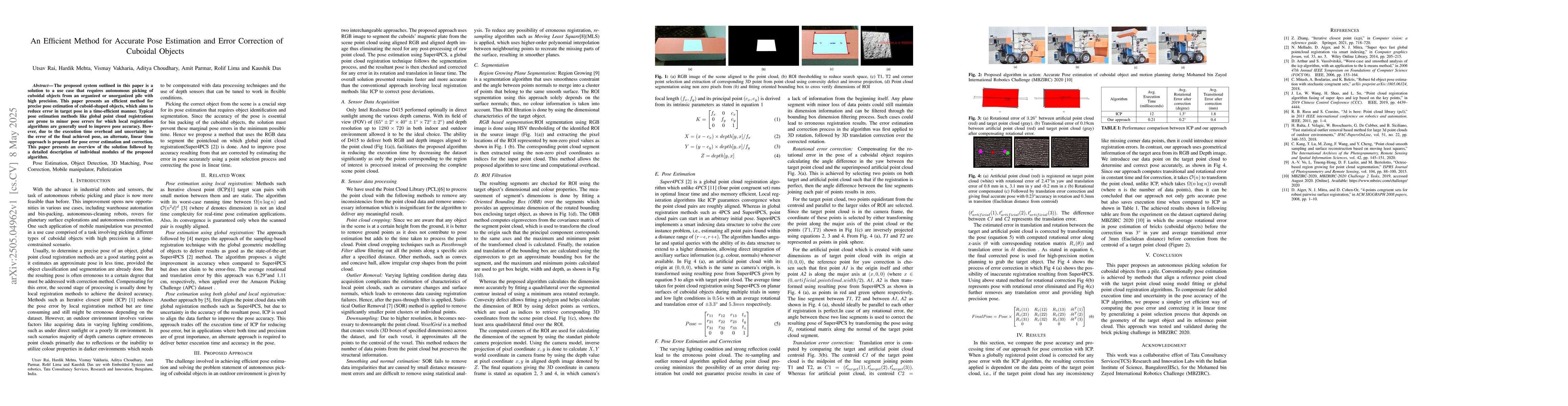 The proposed system outlined in this paper is a solution to a use case that requires the autonomous picking of cuboidal objects from an organized or unorganized pile with high precision. This paper presents an efficient method for precise pose estimation of cuboid-shaped objects, which aims to reduce errors in target pose in a time-efficient manner. Typical pose estimation methods like global point cloud registrations are prone to minor pose errors for which local registration algorithms are generally used to improve pose accuracy. However, due to the execution time overhead and uncertainty in the error of the final achieved pose, an alternate, linear time approach is proposed for pose error estimation and correction. This paper presents an overview of the solution followed by a detailed description of individual modules of the proposed algorithm.