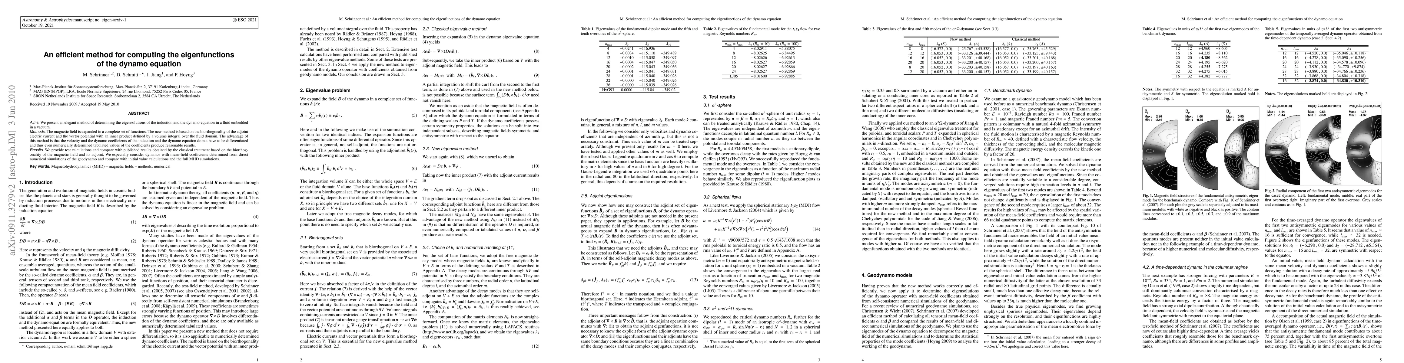 This paper introduces an efficient method for computing the eigenfunctions of the dynamo equation, utilizing the biorthogonality of adjoint electric current and vector potential. This approach avoids the need for differentiating coefficients, making it effective even with numerically derived values.
