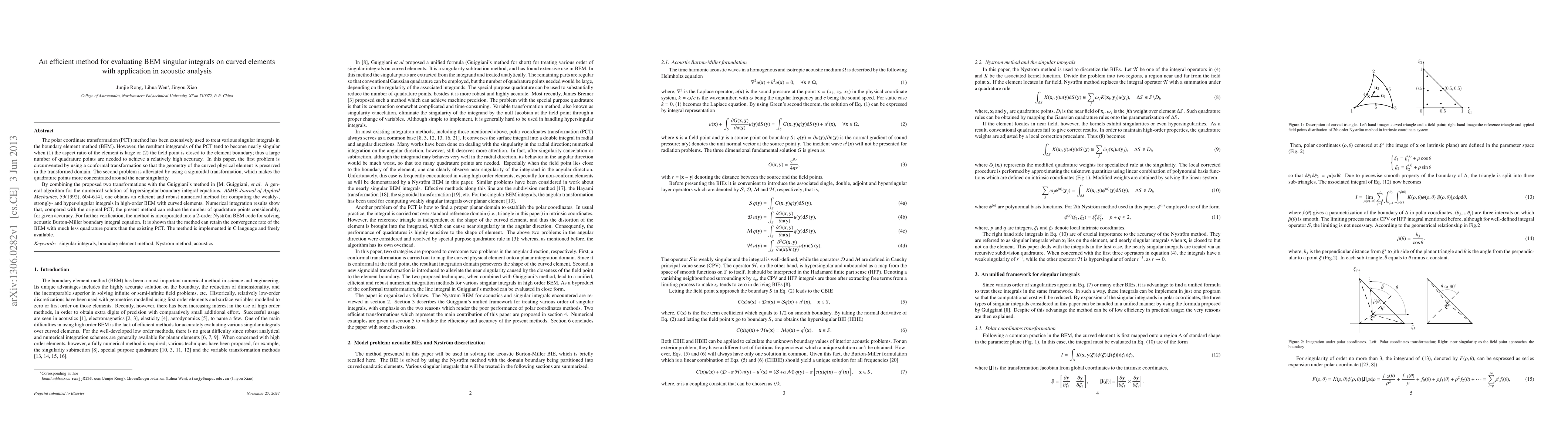 This paper proposes a conformal and sigmoidal transformation method to efficiently evaluate singular integrals in BEM for acoustic analysis, significantly reducing the number of quadrature points compared to the traditional polar coordinate transformation method. The method is applied in a 2-order Nyström BEM code for solving acoustic boundary integral equations, demonstrating improved efficiency and robustness.
