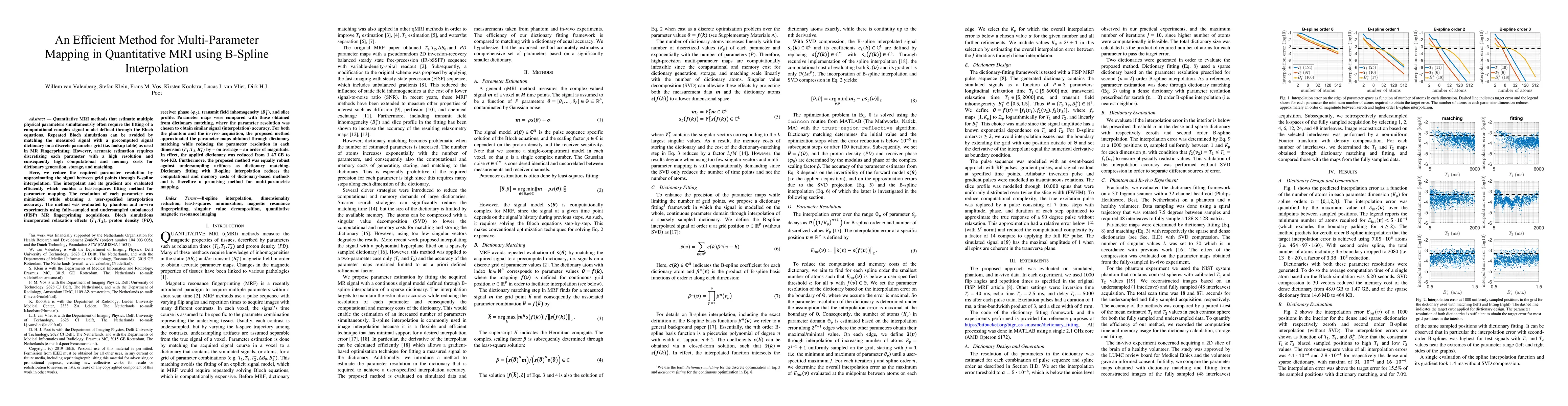 This paper proposes a B-spline interpolation method to efficiently map multiple physical parameters in quantitative MRI, reducing computational and memory costs by minimizing parameter resolution while maintaining interpolation accuracy. The method was validated through phantom and in-vivo experiments, showing significant reduction in dictionary size and comparable parameter map accuracy.