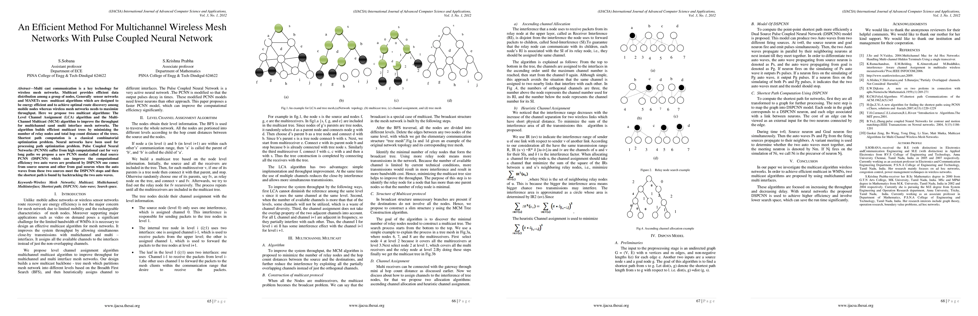 Multi cast communication is a key technology for wireless mesh networks. Multicast provides efficient data distribution among a group of nodes, Generally sensor networks and MANETs uses multicast algorithms which are designed to be energy efficient and to achieve optimal route discovery among mobile nodes whereas wireless mesh networks needs to maximize throughput. Here we propose two multicast algorithms: The Level Channel Assignment (LCA) algorithm and the Multi-Channel Multicast (MCM) algorithm to improve the throughput for multichannel sand multi interface mesh networks. The algorithm builds efficient multicast trees by minimizing the number of relay nodes and total hop count distance of the trees. Shortest path computation is a classical combinatorial optimization problem. Neural networks have been used for processing path optimization problem. Pulse Coupled Neural Networks (PCNNS) suffer from high computational cast for very long paths we propose a new PCNN modal called dual source PCNN (DSPCNN) which can improve the computational efficiency two auto waves are produced by DSPCNN one comes from source neuron and other from goal neuron when the auto waves from these two sources meet the DSPCNN stops and then the shortest path is found by backtracking the two auto waves.