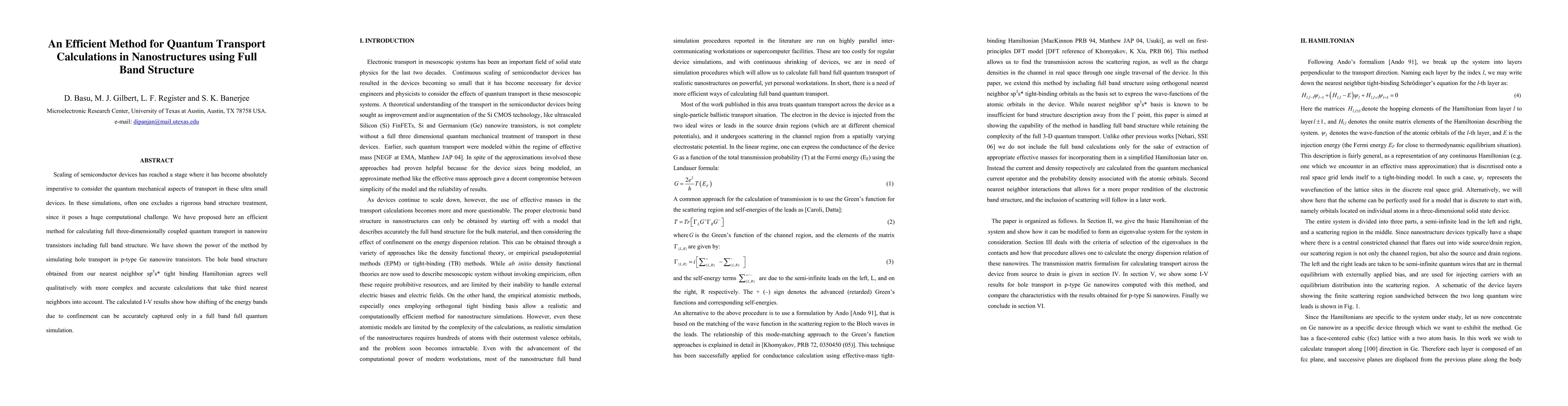 This paper proposes an efficient method for quantum transport calculations in nanostructures that incorporates full band structure, demonstrating its application in simulating hole transport in p-type Ge nanowire transistors. The method accurately captures energy band shifts due to confinement, showing good qualitative agreement with more complex calculations.