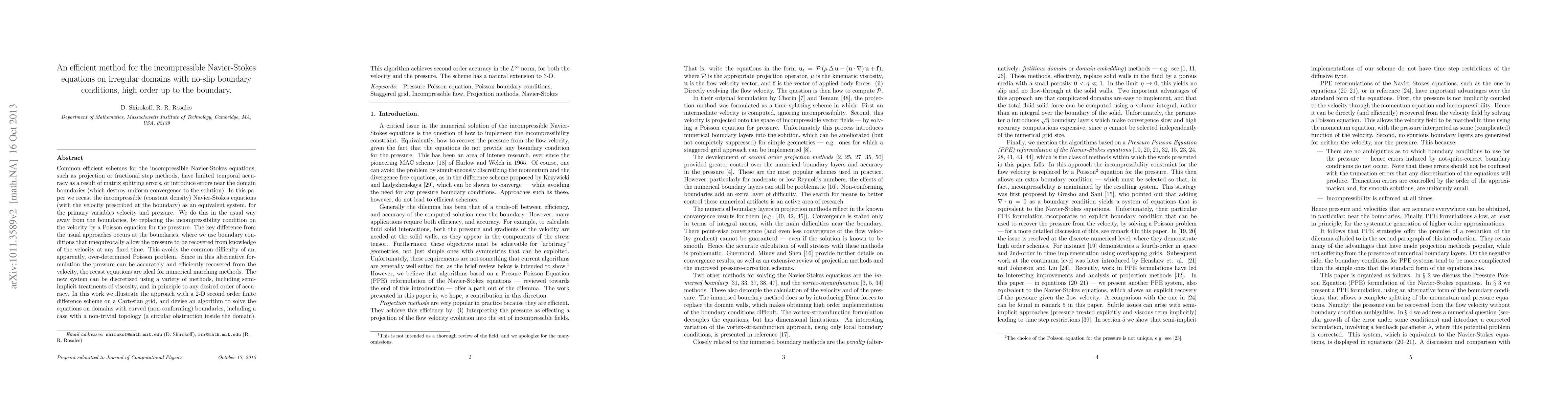 This paper presents a novel method for solving the incompressible Navier-Stokes equations on irregular domains with high temporal and spatial accuracy. By reformulating the equations, the authors avoid common errors from matrix splitting or boundary treatments. They demonstrate a second-order accurate 2D finite difference scheme for curved boundaries, with a potential extension to 3D, providing precise velocity and pressure data.