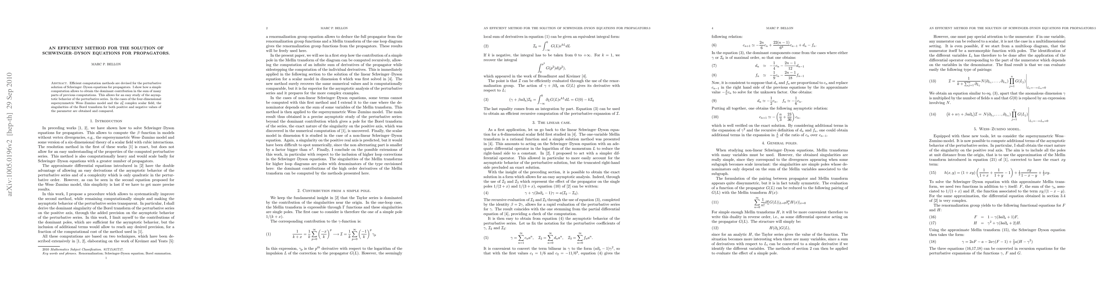 Efficient computation methods are devised for the perturbative solution of Schwinger--Dyson equations for propagators. We show how a simple computation allows to obtain the dominant contribution in the sum of many parts of previous computations. This allows for an easy study of the asymptotic behavior of the perturbative series. In the cases of the four-dimensional supersymmetric Wess--Zumino model and the $\phi_6^3$ complex scalar field, the singularities of the Borel transform for both positive and negative values of the parameter are obtained and compared.