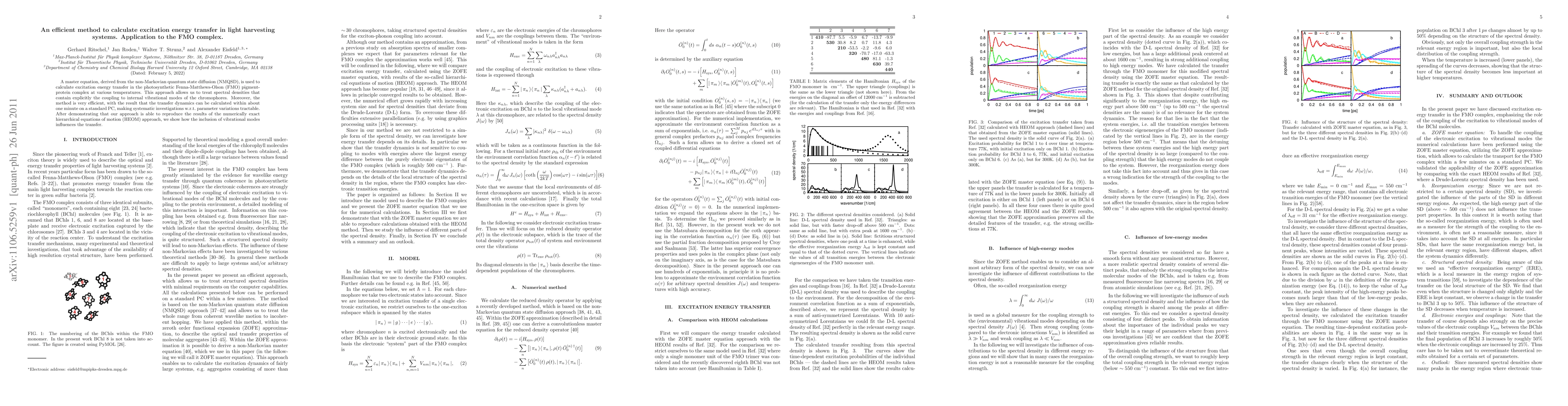 This paper presents an efficient master equation method derived from non-Markovian quantum state diffusion to calculate excitation energy transfer in the FMO complex, demonstrating its ability to reproduce results of the numerically exact hierarchical equations of motion approach and showing how vibrational modes affect transfer dynamics. The method allows for rapid calculations, facilitating systematic investigations.