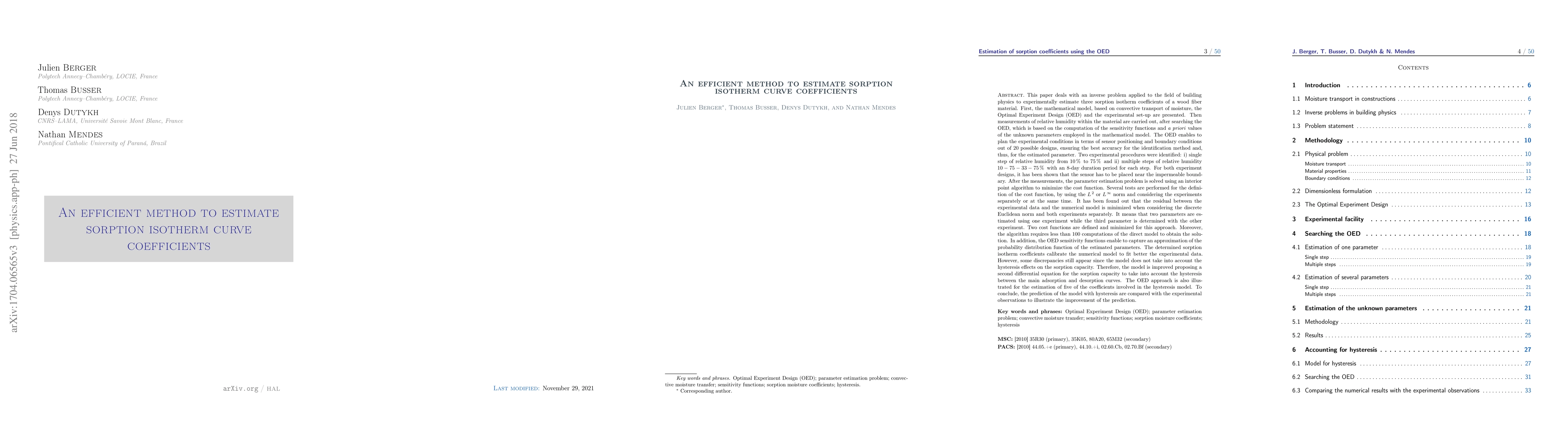 Researchers developed an efficient method to estimate sorption isotherm curve coefficients using Optimal Experiment Design (OED) and experimental setup, achieving accurate parameter estimation with minimal computational cost.