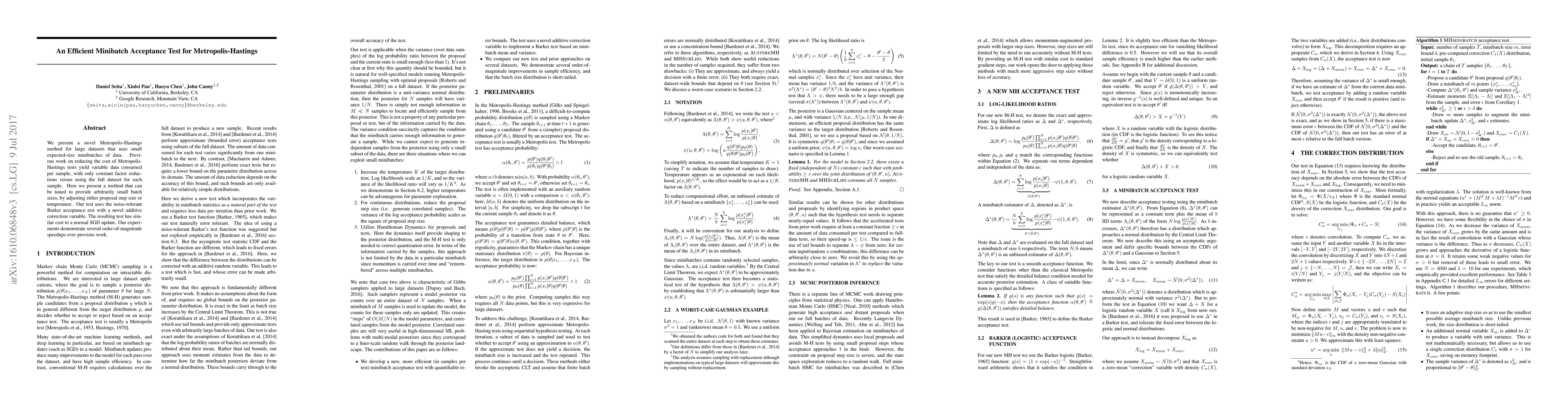 This paper introduces a novel minibatch acceptance test for the Metropolis-Hastings algorithm that uses small data subsets, achieving significant speedups over previous methods while maintaining variable batch sizes through tuning. The method employs a noise-tolerant Barker acceptance test with an additive correction variable, demonstrating substantial improvements in computational efficiency.