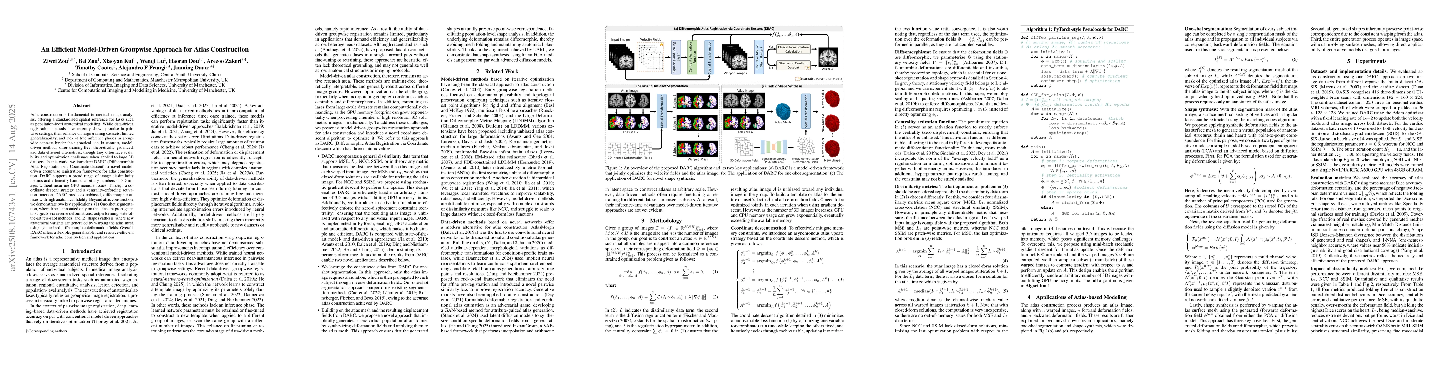 Atlas construction is fundamental to medical image analysis, offering a standardized spatial reference for tasks such as population-level anatomical modeling. While data-driven registration methods have recently shown promise in pairwise settings, their reliance on large training datasets, limited generalizability, and lack of true inference phases in groupwise contexts hinder their practical use. In contrast, model-driven methods offer training-free, theoretically grounded, and data-efficient alternatives, though they often face scalability and optimization challenges when applied to large 3D datasets. In this work, we introduce DARC (Diffeomorphic Atlas Registration via Coordinate descent), a novel model-driven groupwise registration framework for atlas construction. DARC supports a broad range of image dissimilarity metrics and efficiently handles arbitrary numbers of 3D images without incurring GPU memory issues. Through a coordinate descent strategy and a centrality-enforcing activation function, DARC produces unbiased, diffeomorphic atlases with high anatomical fidelity. Beyond atlas construction, we demonstrate two key applications: (1) One-shot segmentation, where labels annotated only on the atlas are propagated to subjects via inverse deformations, outperforming state-of-the-art few-shot methods; and (2) shape synthesis, where new anatomical variants are generated by warping the atlas mesh using synthesized diffeomorphic deformation fields. Overall, DARC offers a flexible, generalizable, and resource-efficient framework for atlas construction and applications.