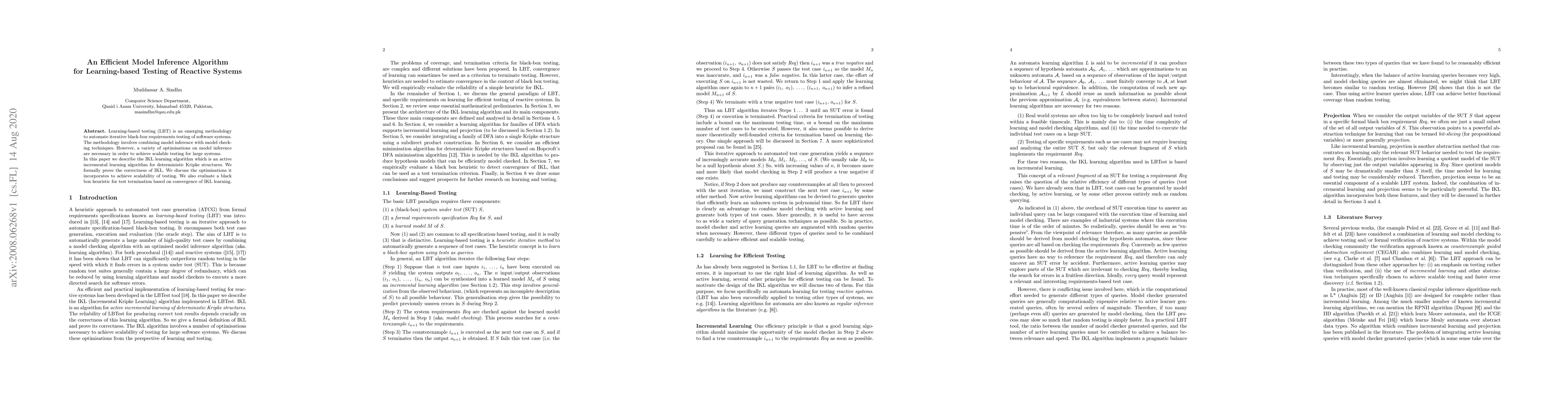 Learning-based testing (LBT) is an emerging methodology to automate iterative black-box requirements testing of software systems. The methodology involves combining model inference with model checking techniques. However, a variety of optimisations on model inference are necessary in order to achieve scalable testing for large systems. In this paper we describe the IKL learning algorithm which is an active incremental learning algorithm for deterministic Kripke structures. We formally prove the correctness of IKL. We discuss the optimisations it incorporates to achieve scalability of testing. We also evaluate a black box heuristic for test termination based on convergence of IKL learning.