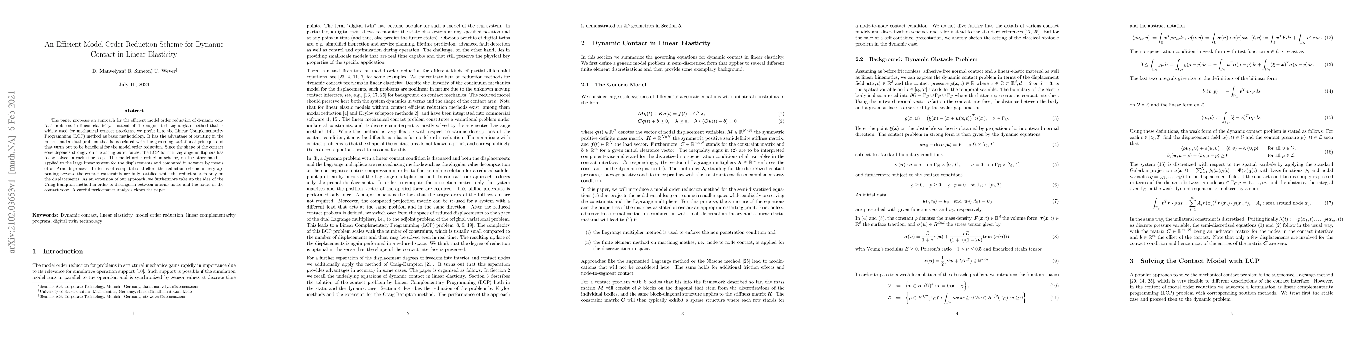 The paper proposes an approach for the efficient model order reduction of dynamic contact problems in linear elasticity. Instead of the augmented Lagrangian method that is widely used for mechanical contact problems, we prefer here the Linear Complementarity Programming (LCP) method as basic methodology. It has the advantage of resulting in the much smaller dual problem that is associated with the governing variational principle and that turns out to be beneficial for the model order reduction. Since the shape of the contact zone depends strongly on the acting outer forces, the LCP for the Lagrange multipliers has to be solved in each time step. The model order reduction scheme, on the other hand, is applied to the large linear system for the displacements and computed in advance by means of an Arnoldi process. In terms of computational effort the reduction scheme is very appealing because the contact constraints are fully satisfied while the reduction acts only on the displacements. As an extension of our approach, we furthermore take up the idea of the Craig-Bampton method in order to distinguish between interior nodes and the nodes in the contact zone. A careful performance analysis closes the paper.
