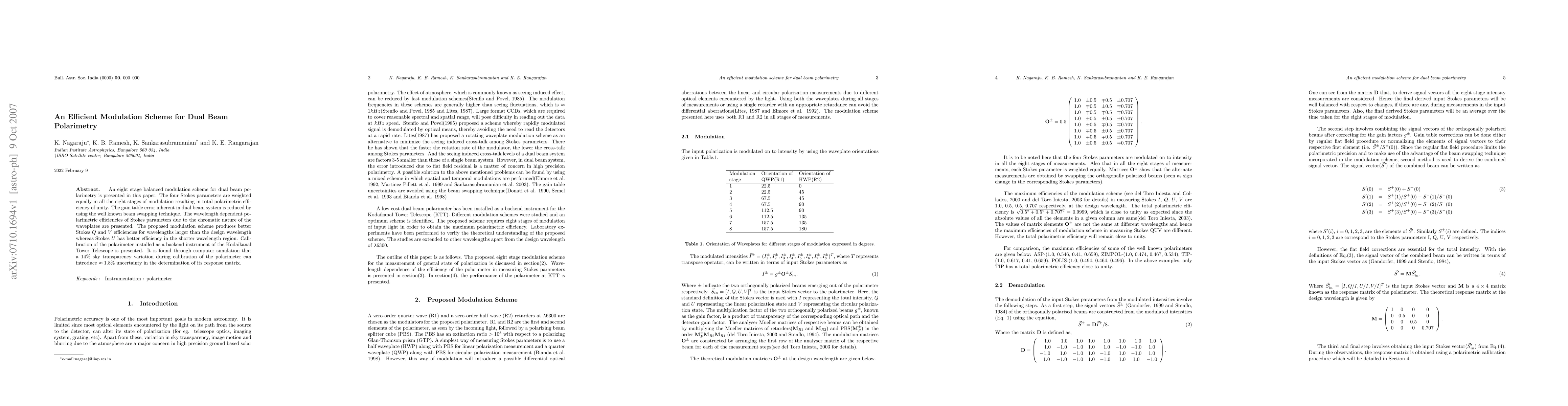 A new modulation scheme for dual beam polarimetry is presented, reducing gain table errors and improving polarimetric efficiency, with implications for calibrating polarimeters in astronomy.
