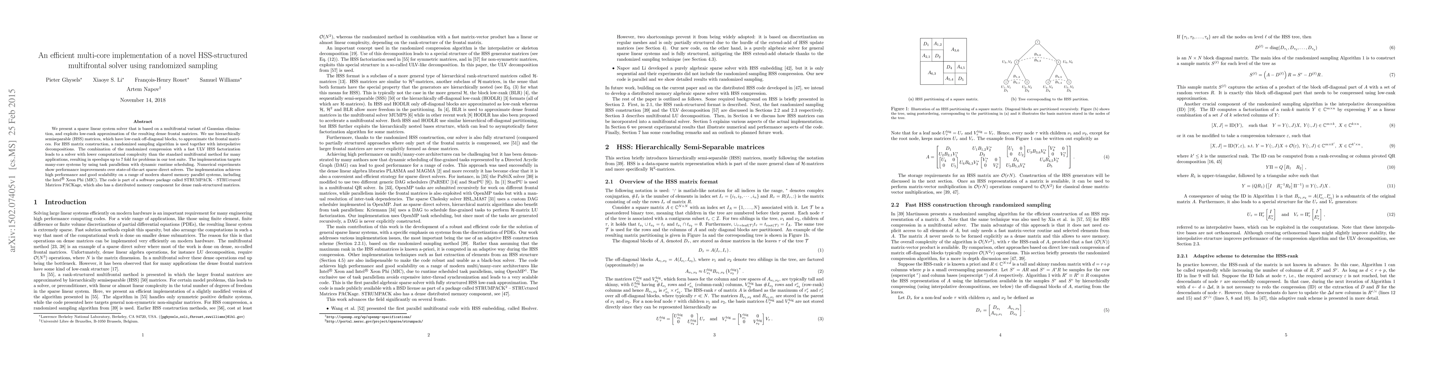 This paper presents a novel multifrontal solver for sparse linear systems using hierarchically semiseparable (HSS) matrices and randomized sampling for low-rank approximations, achieving up to 7-fold speedups over standard methods. The solver is efficiently implemented on many-core systems with task parallelism, demonstrating high performance and scalability.