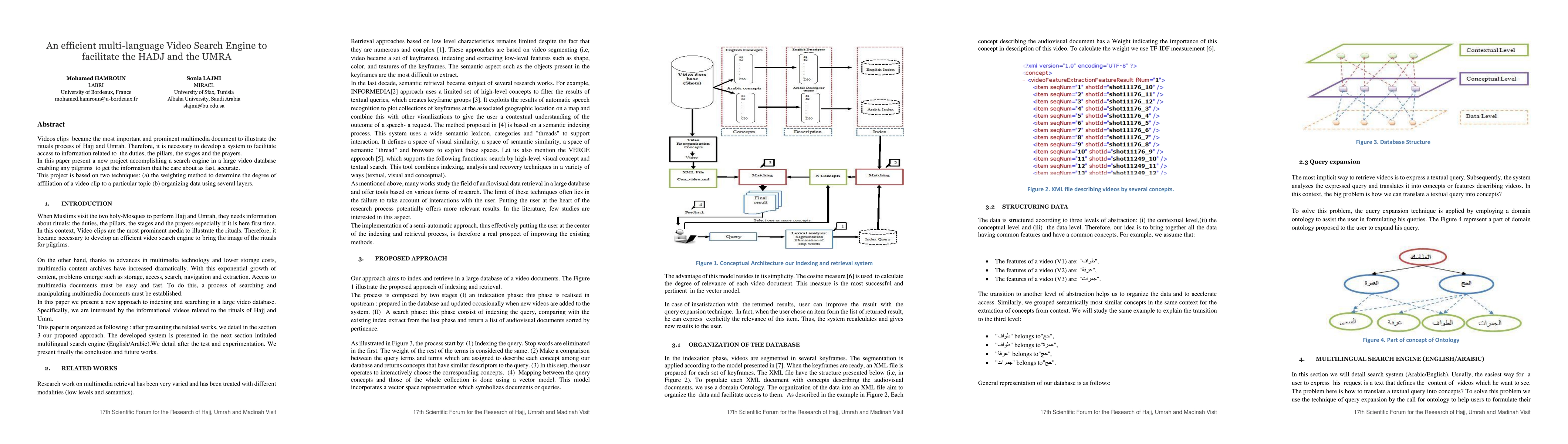 The research presents a multi-language video search engine for Hajj and Umrah rituals, utilizing a weighting method and multi-layer data organization, with evaluation based on precision and recall using a database of 1000 videos.