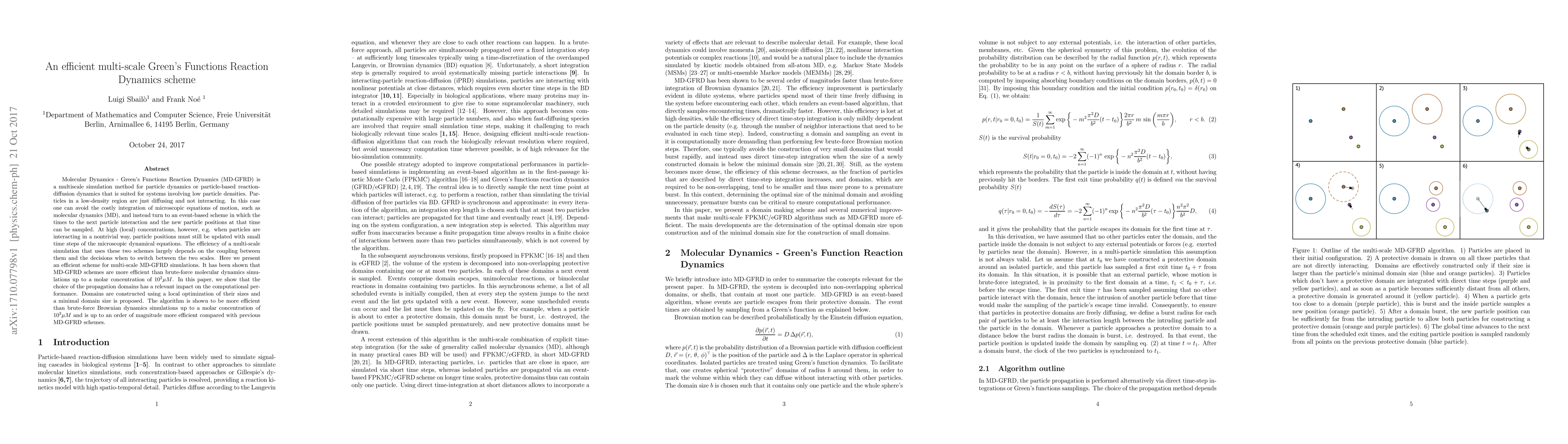 This paper introduces an efficient multi-scale Green's Functions Reaction Dynamics (MD-GFRD) scheme for simulating particle dynamics in low to moderately dense systems, switching between event-based and microscopic dynamics to optimize computational efficiency. The proposed scheme significantly outperforms brute-force molecular dynamics and previous MD-GFRD methods, especially at higher concentrations.