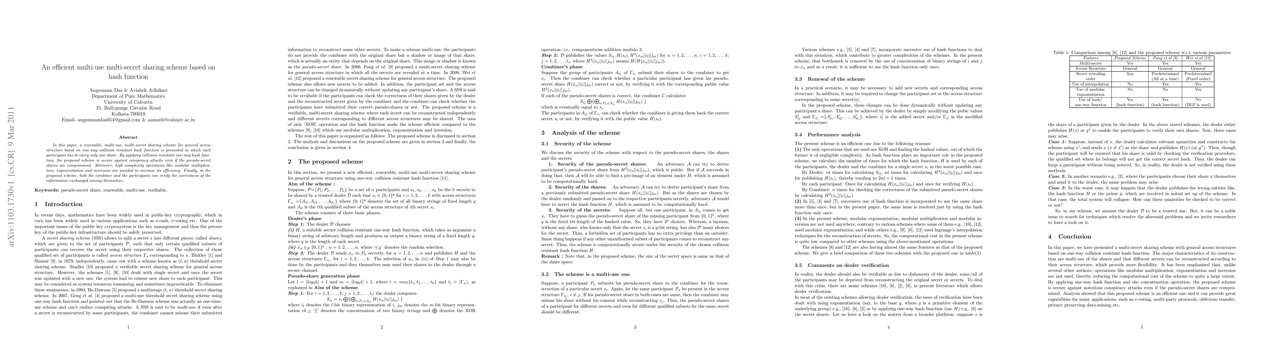 This paper introduces a renewable, multi-use multi-secret sharing scheme based on collision-resistant hash functions, ensuring security against conspiracy attacks and efficiency by avoiding complex operations. Participants only need one share, and both parties can verify information correctness.